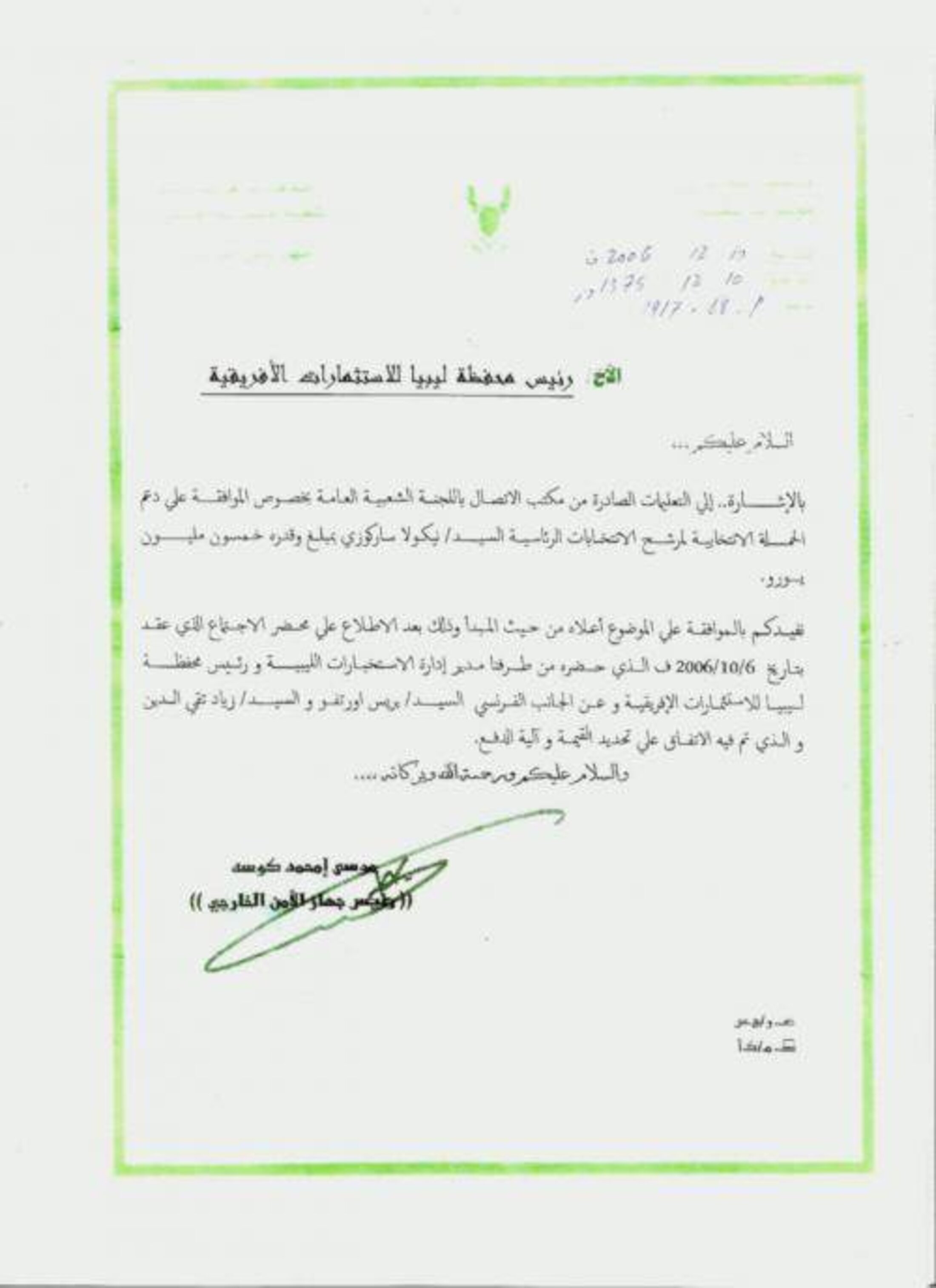 The document, signed by the then head of Libya's foreign intelligence agency, Moussa Koussa, detailed how Gaddafi’s regime had agreed to “support the electoral campaign” of Nicolas Sarkozy for the 2007 presidential elections, and for the “sum of fifty million euros” (click on the 'Prolonger' tab top of page for an English translation of the full text).