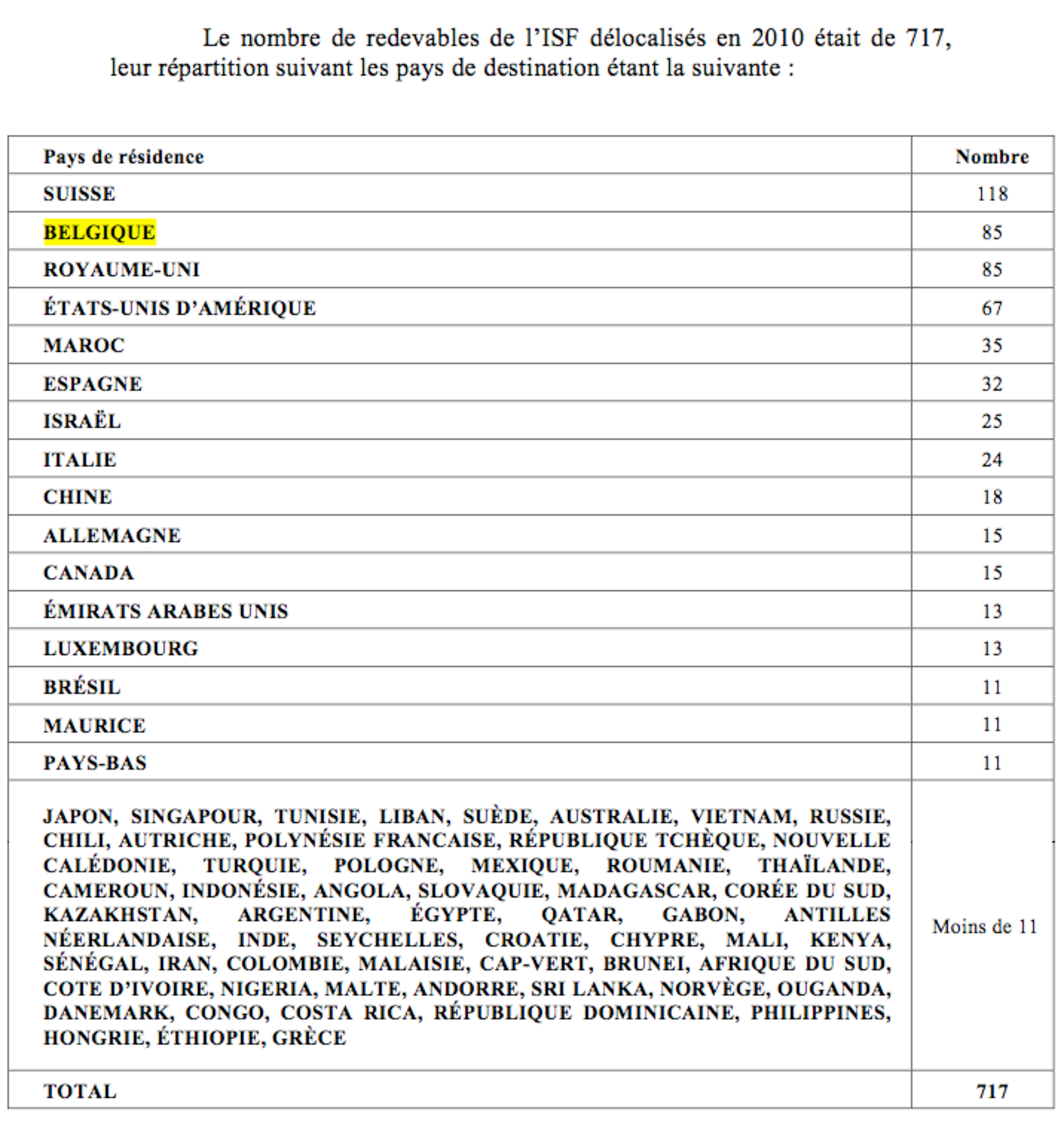 The table below is a compilation of the numbers of 2010 expatriations of people and households liable to pay the ISF, based on the ministry’s information and published in a recent French Senate committee report on the flight of capital and assets from France and the effects this has on the fiscal system (available, in French only, here and here).