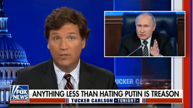 Plusieurs manifestants se sont rassemblés devant le siège de la chaîne conservatrice américaine, à New York, pour demander le départ de Tucker Carlson, un polémiste influent à qui ils reprochent des prises de position favorables à Vladimir Poutine.