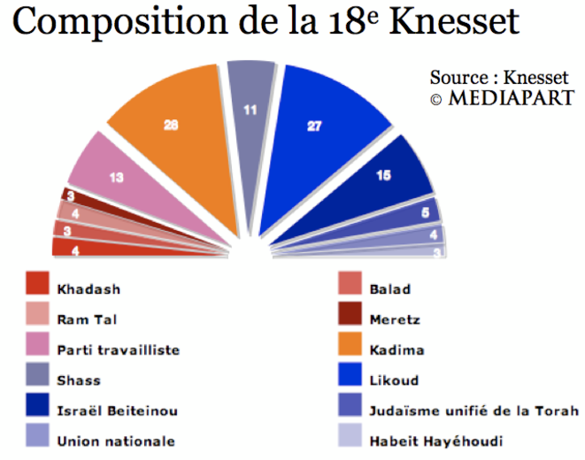 Le président israélien Shimon Peres a désigné, vendredi 20 février, le leader du Likoud, Benjamin Netanyahou, pour former un gouvernement. Selon les informations recueillies par Mediapart, Benjamin Netanyahou va rencontrer Tzipi Livni, dimanche 22 février, pour lui proposer le ministère de la défense. Avigdor Lieberman aurait demandé lui, le ministère de l'économie. Benjamin Netanyahou réfléchit à une alliance avec le centre pour éviter de donner trop de poids à l'extrême droite et ne pas s'attirer les foudres de Washington.