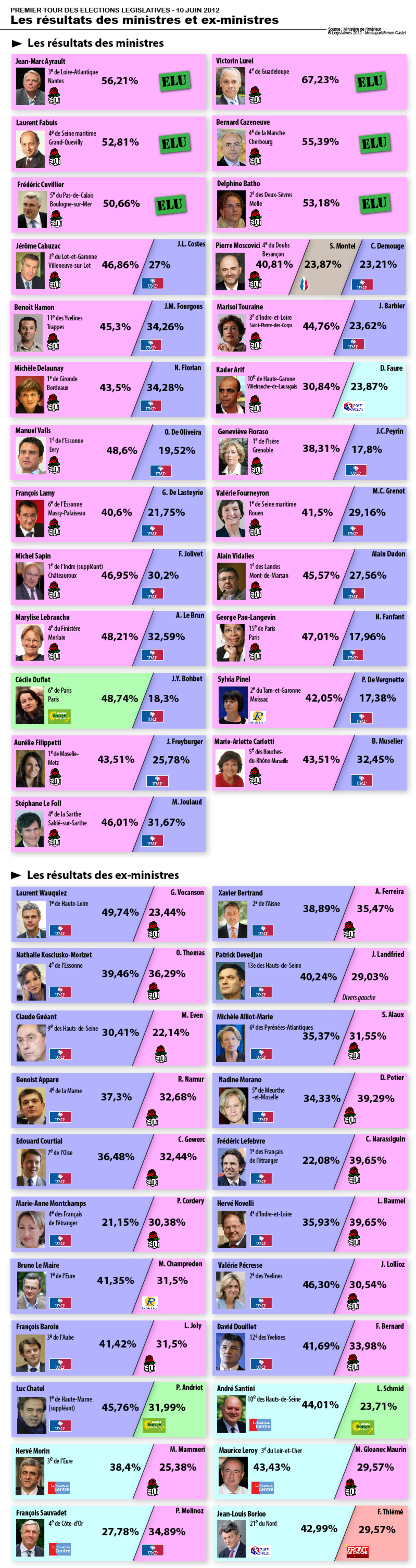 Six ministres socialistes, sur les 25 en course pour les législatives, ont été élus au premier tour des élections législatives. Un sort qu'aucun des anciens ministres de Nicolas Sarkozy n'a connu. Pour chacun, retrouvez les configurations pour le second tour.