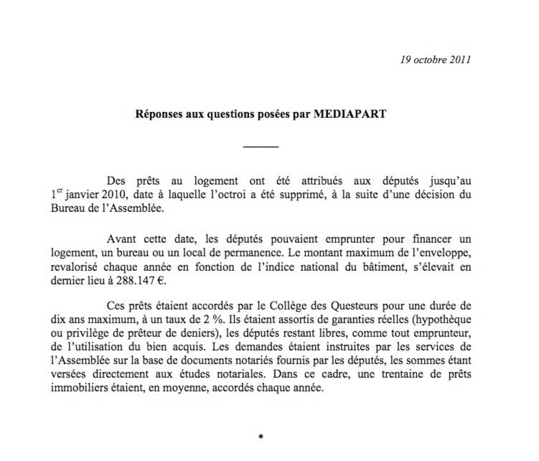 In a written response (see below) in October 2011 to questions from Mediapart about how the loans for MPs system functioned, the National Assembly replied: