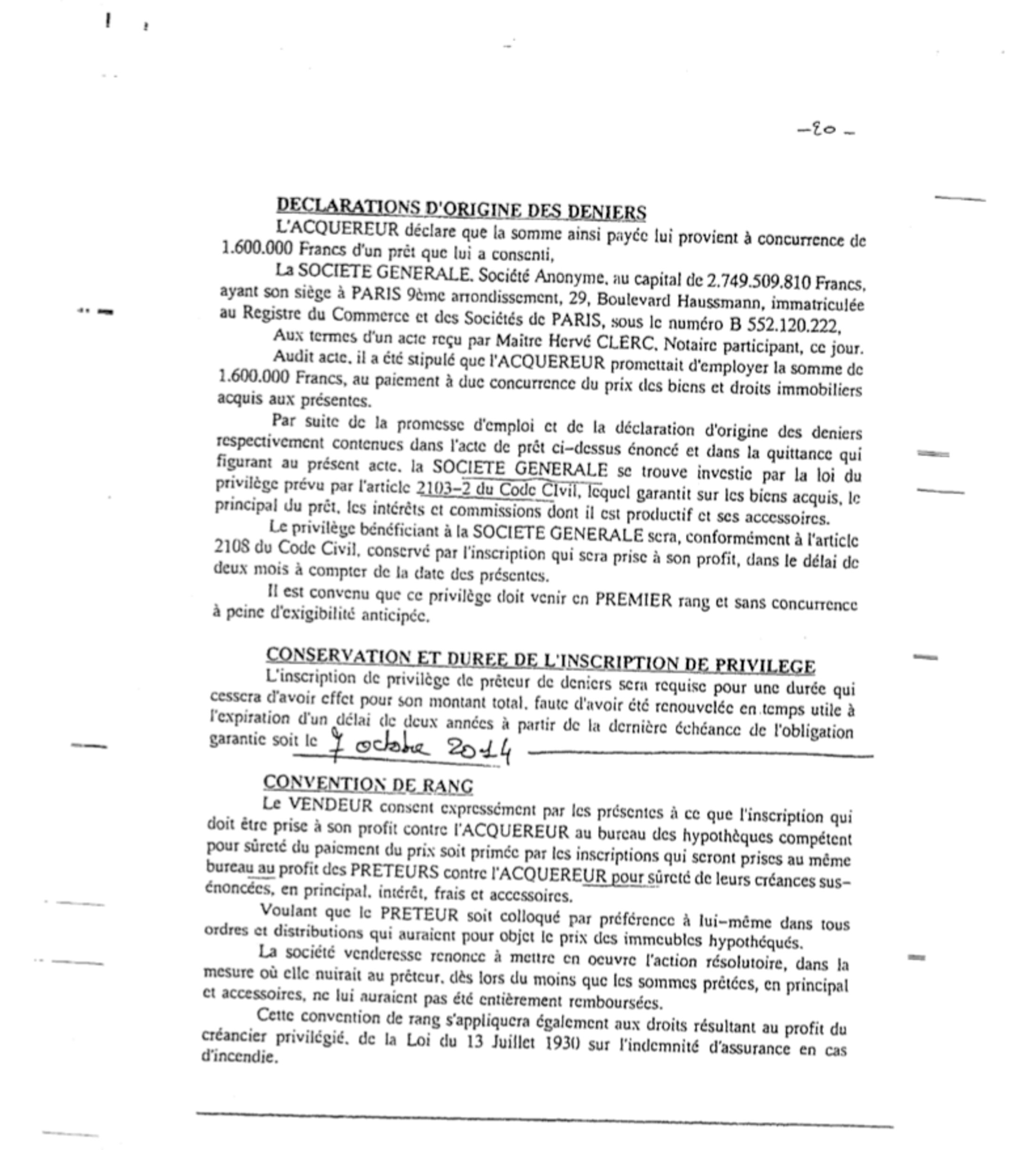 In substance, this note added by Sarkozy says that he will look after finding any extra money necessary for his purchase. But there is no detail of how he will do this, beyond the 270,000 francs handed over in the initial guarantee of purchase agreement, and the 1.6 million francs lent to him by the Société Générale bank.