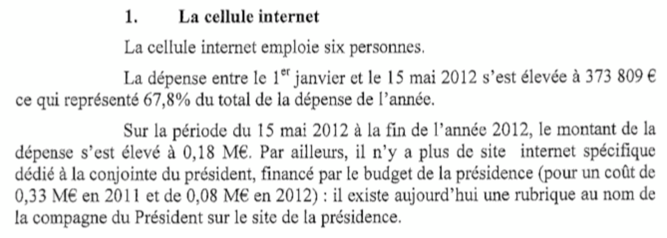 But another target of the spending cuts under Hollande, reported the Court of Accounts, was the Elysée’s spending on its PR budget and notably its internet activities. “Between January 1st and May 15th,” revealed the report, reffering to the five and a half months of 2012 under the Sarkozy presidency, “the Elysée spent 373,809 euros on its internet department. Over the following six months, under François Hollande, spending was strongly reduced, bringing it down to 180,000 euros. Among the savings made was the closure of the First Lady’s website.”