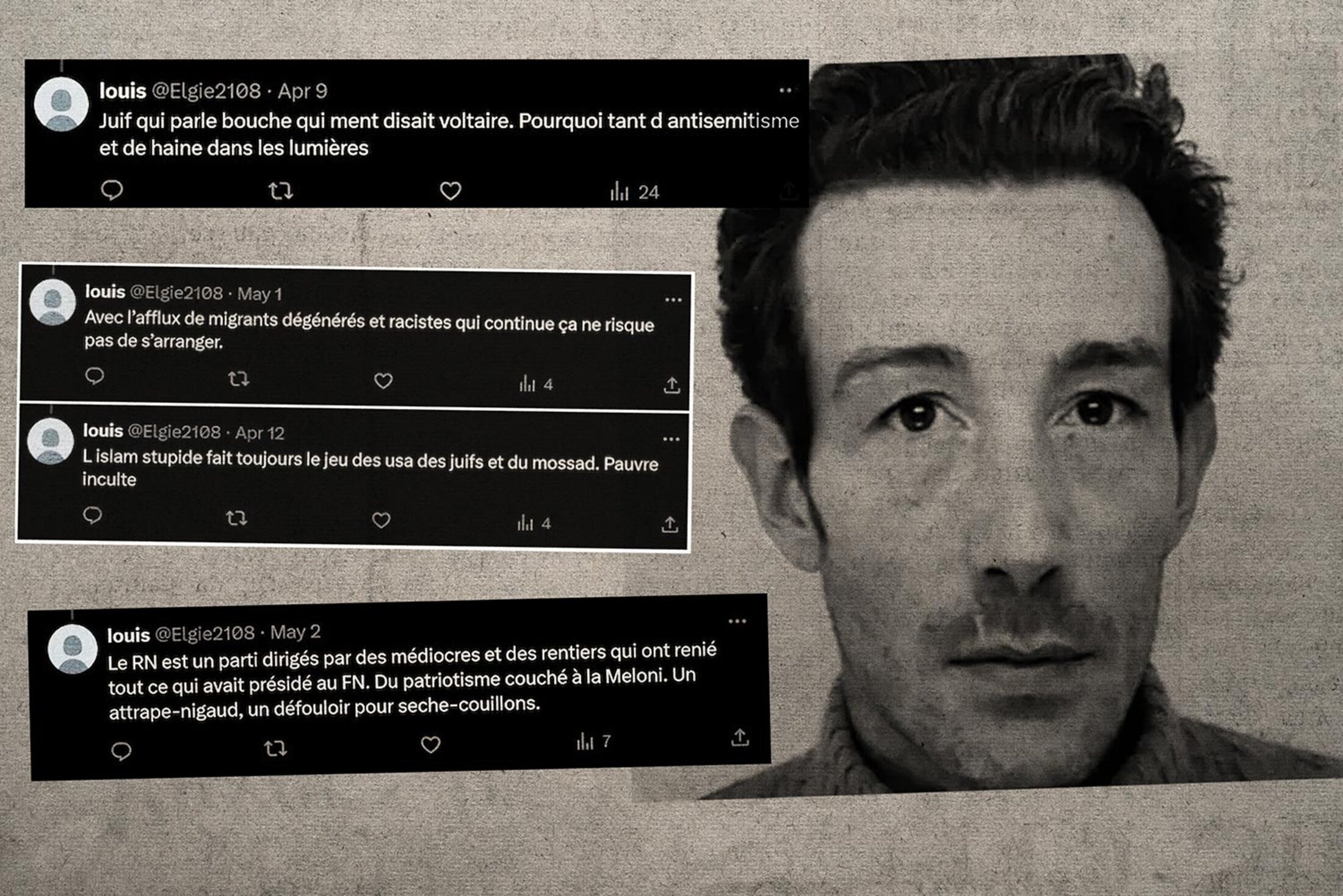The posts (see examples below), in which he obscenely insulted Jews, women and homosexuals, were revealed by the French investigative website StreetPress. They were published on an anonymous account on X which Pecher finally admitted was his own. The comments included “Jew who talks, mouth that lies, said Voltaire”, in response to a post by Jewish politician Julien Dray on the Israeli-Palestinian conflict. “With the influx that continues of degenerate and racist migrants nothing’s likely to get better,” and “Stupid Islam always plays into the hands of the USA, the Jews and the Mossad” read two others.
