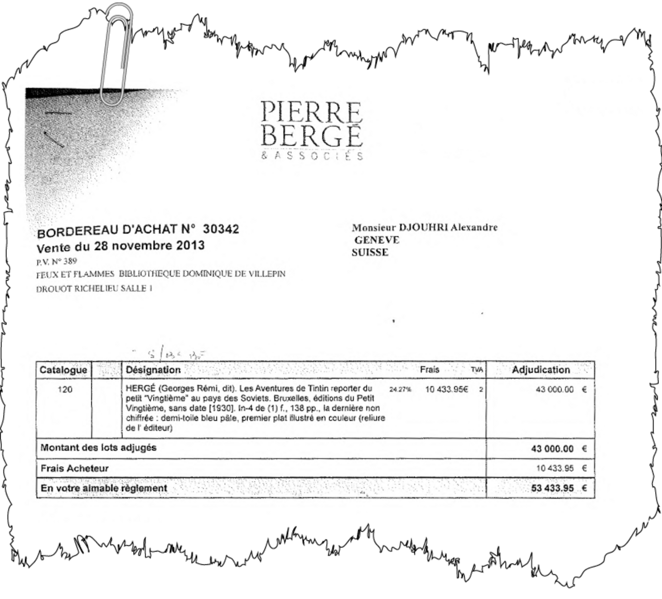 Yet investigators have proof of the payment made by Djouhri to Villepin. And several phone taps leave little room for doubt that the two had conversations that touched on the subjects of both business and money. They show, for example, the insistence on Villepin's part that Djouhri completed the purchase of an original Tintin comic book ('Tintin au pays des Soviets') sold at auction in 2013 by the ex-premier. The sale of Villepin's collection of old books raised around 3 million euros. As Le Monde has already noted, the purchase of the book seems to have been carried out through a third party. And the telephone conversations showed Djouhri's obsession with not paying in his own name or being seen to buy in his own name. This was despite the fact that it appears on a bill of sale. The payment was made through a Dubai-based company called Iscande, of whose existence Villepin says he was unaware.
