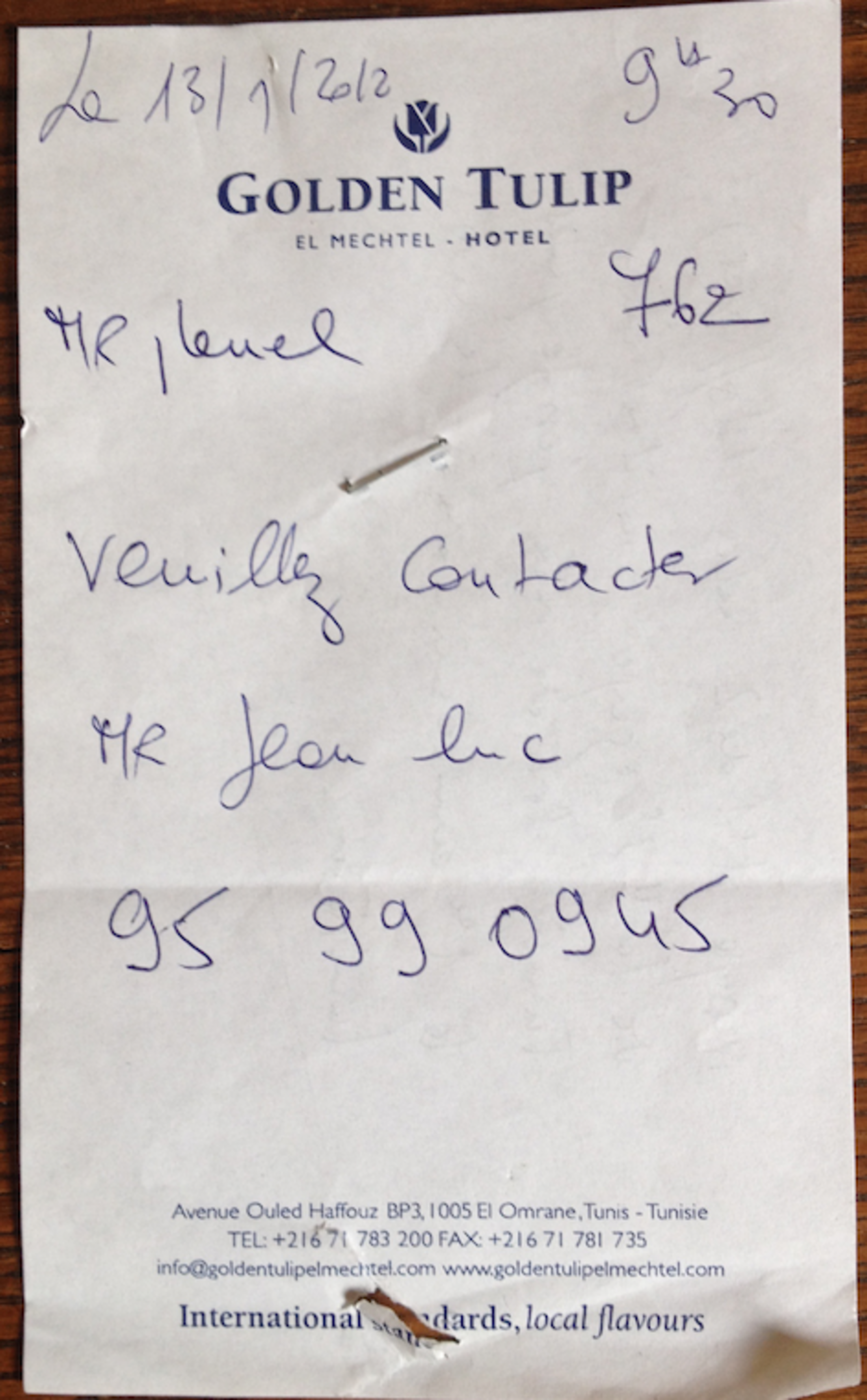 We met the following Thursday, July 30th. It was our second meeting following the one on Friday January 13th 2012, in Tunis, in the middle of post-revolutionary fervour in Tunisia. Colonel Kister was working there for the United Nations security department, the UNDSS, who were his employers from 2000 to 2014 in Iraq, Lebanon, Kurdistan, Burundi and Tunisia. He had just heard me on a local radio station speaking about the freedom of the press and the right to information, which was the purpose of my trip to meet the Tunisian media. When I got back to my hotel I found a note (see below, right) that had been slipped under my door inviting me to call “Mr Jean Luc”, without giving any more details.