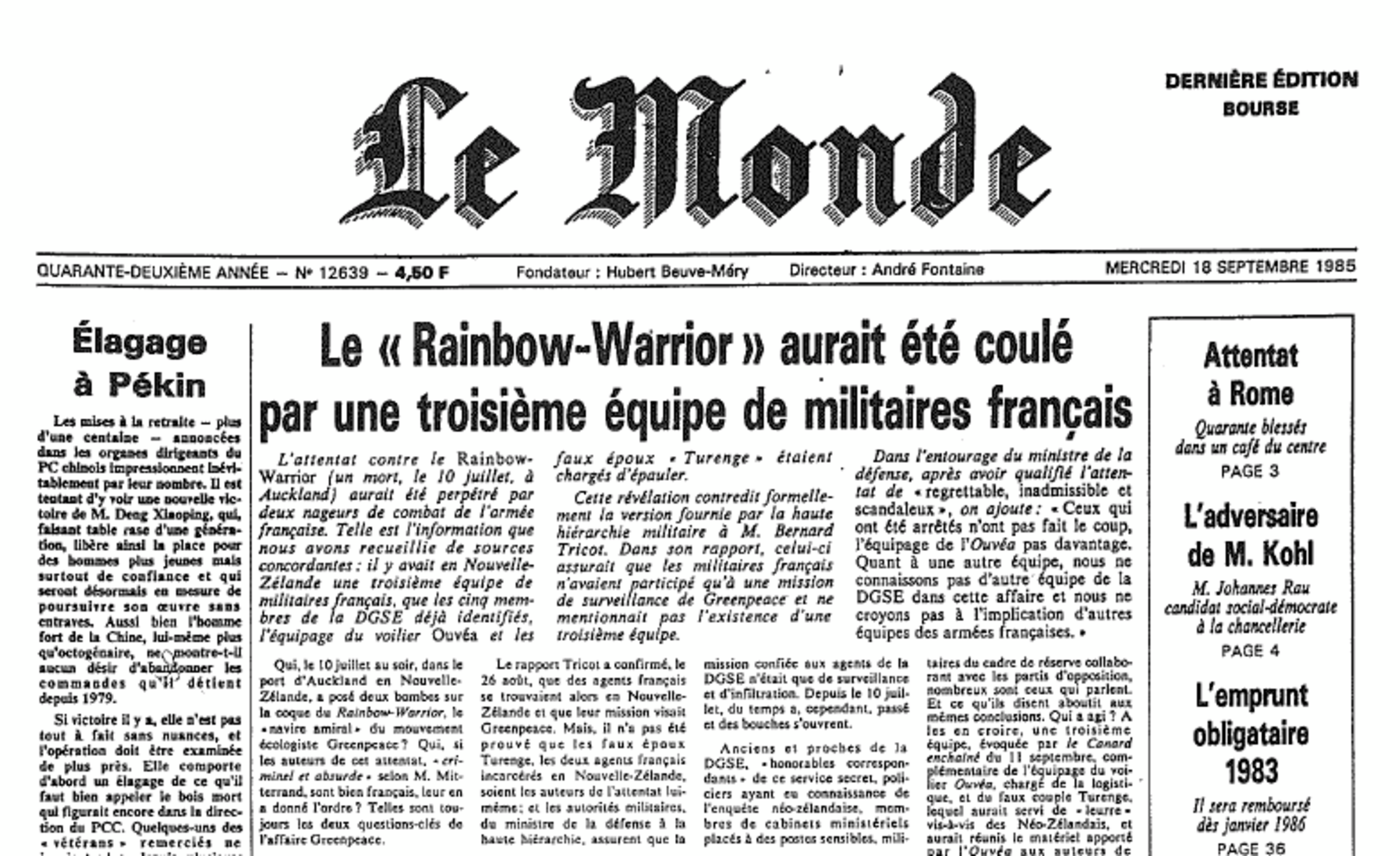 However, the strategy of lie-telling adopted by the French president nearly worked. Were it not for the revelation by Le Monde on September 17th 1985, under my byline and that of Bertrand Le Gendre, of the existence of a third team of frogmen whose task it was to place the two explosive charges, the fake story put about that the DGSE were involved in a simple surveillance mission would have continued to gain ground, with the complicity of those media opposed to investigative journalism.