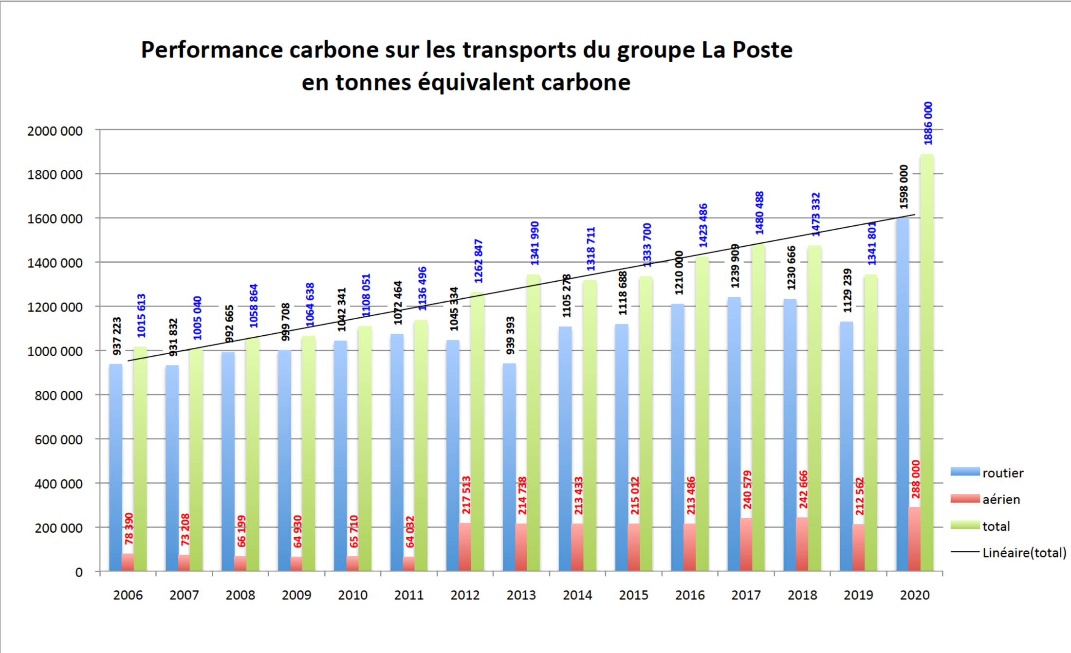 However, the problem is not a one-off as the group's statement seems to suggest. Compiling data from transport emissions for the whole group since 2006 shows that there has been a spectacular 46% increase in the production of CO2 by the group. In other words, over the past 15 years La Poste has been emitting more and more greenhouse gases, contrary to its official objectives and its own statements.