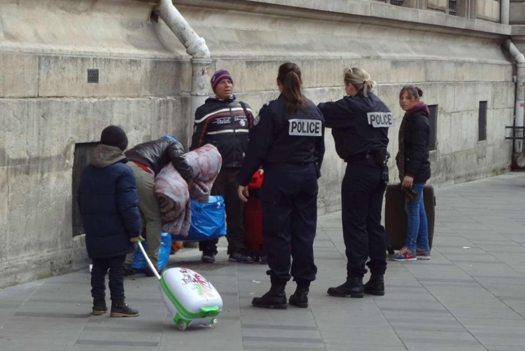 The Roma get the message that they are not wanted. But where can they go? With state-run emergency shelter already overwhelmed by demand, the best such families can hope for is a few nights in an hotel before finding themselves on the streets once more. And the police are aware of this. Is it an attempt to get them to return to their country of origin? As European Union citizens Romanian and Bulgarian Roma can be expelled from France if they stay longer than three months “without adequate resources”. But there is nothing to stop them returning a few weeks later. The result of all this is that the police simply deal with the most visible aspect of the problem. To show that they are taking action – particularly to local residents and shopkeepers – they resort to the kind of hassling seen in this video and in the photograph.