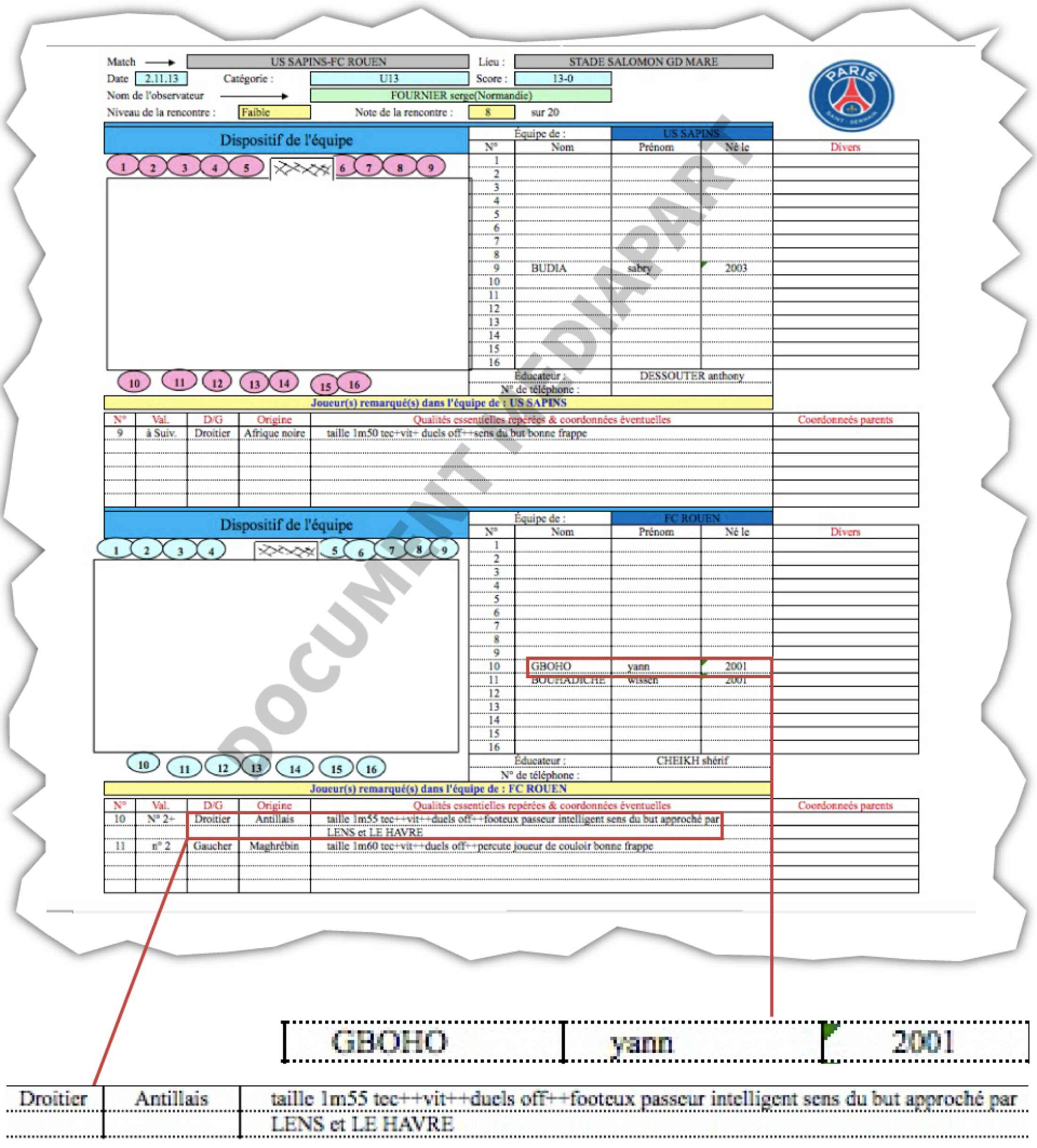 Serge Fournier was unaware, or now pretends to have been unaware, that in between times the name of Yann Gboho had caused a stir at PSG, as illustrated by an internal club report about a meeting on coaching activities held on March 14th 2014. Around the table at that meeting were seven people responsible for recruitment and coaching of young players at PSG, and who included Marc Westerloppe.