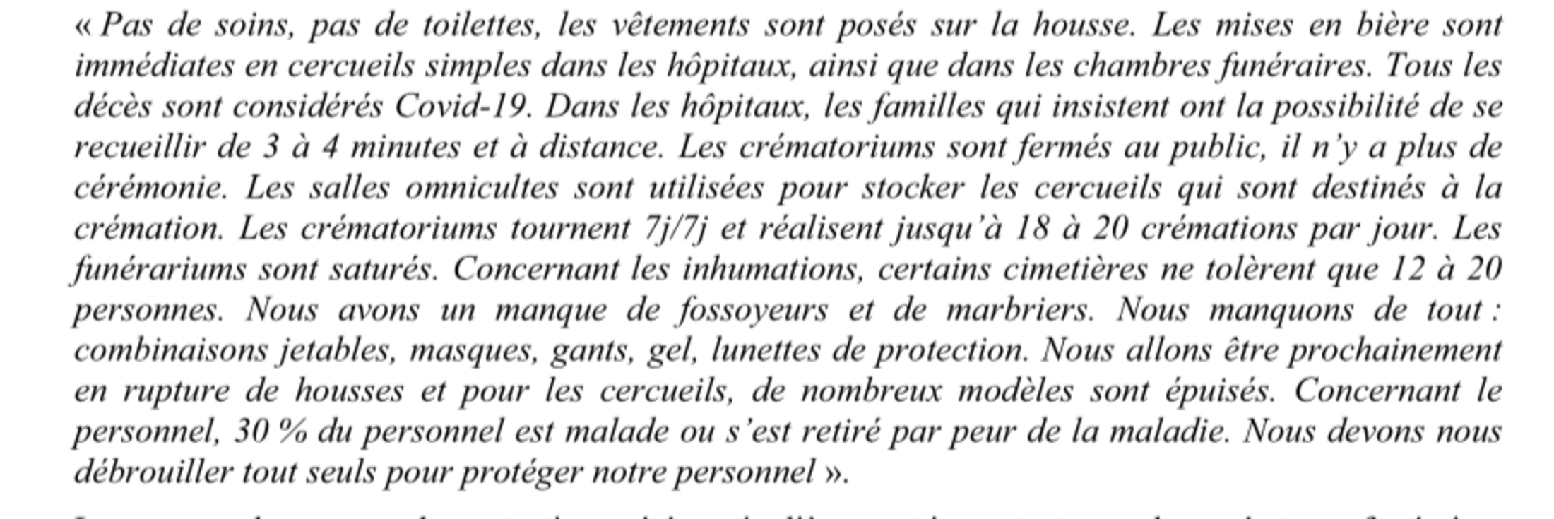 This was all done in great discretion. “This information, widely condemned by the funeral operator federations, was passed on only after the end of the lockdown, with these decisions having been made in a hurry, without explanation, because of the crisis.”