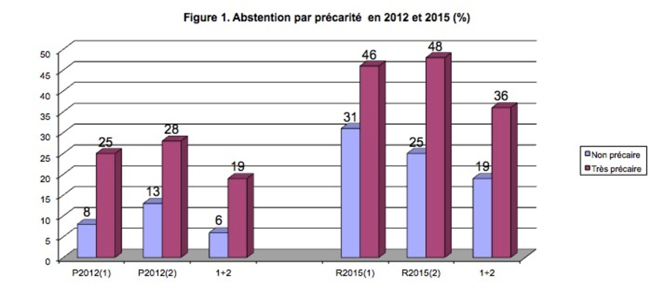 The 2015 regional elections saw a much lower turnout than the presidential poll, but there are still similar differences in the relative levels of participation. This is especially true in the second round where the abstention rate among the very poor is 23 points higher than the better off. The more impoverished one is the less one makes one's voice heard, the less one counts. Social exclusion feeds political exclusion.