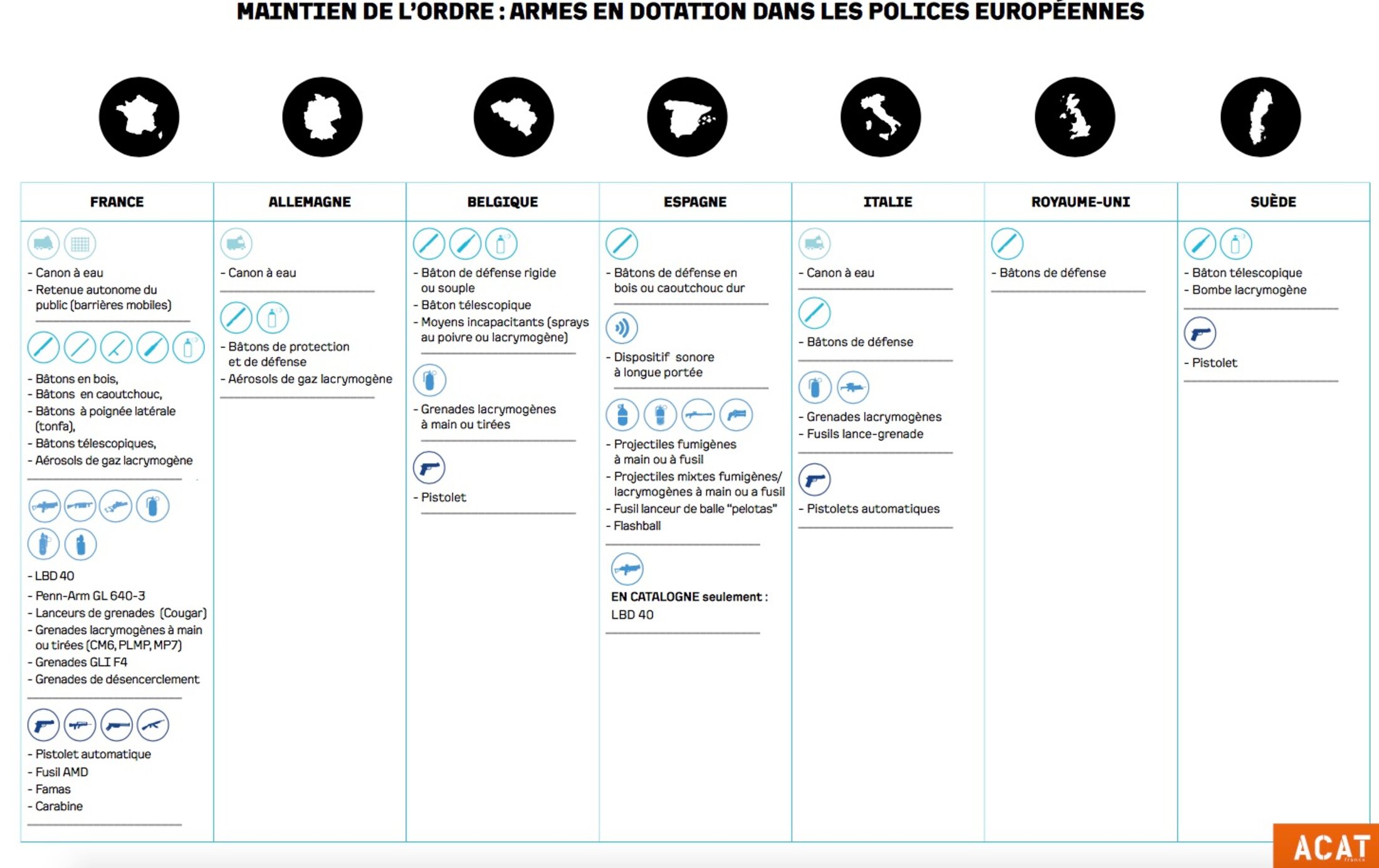 As well as this comparative chart (see below) which highlights this dangerous French exception and which was recently released by Action by Christians against Torture (ACAT), one must add the analysis of the sociologist Fabien Jobard – a specialist on the police - who underlines the “considerable scale” of the repressive actions taken against the yellow vests. He says: “The police interventions have led on many occasions to considerable damage: hands blown off by grenades, disfiguration or loss of an eye caused by shots from self-defence ball launchers, a death in Marseille: the toll has gone beyond anything we've seen in metropolitan France since May '68, when the levels of violence and protestors' weapons were far higher, and the level of protection of the police quite simply ridiculous with regard to what it is today.”
