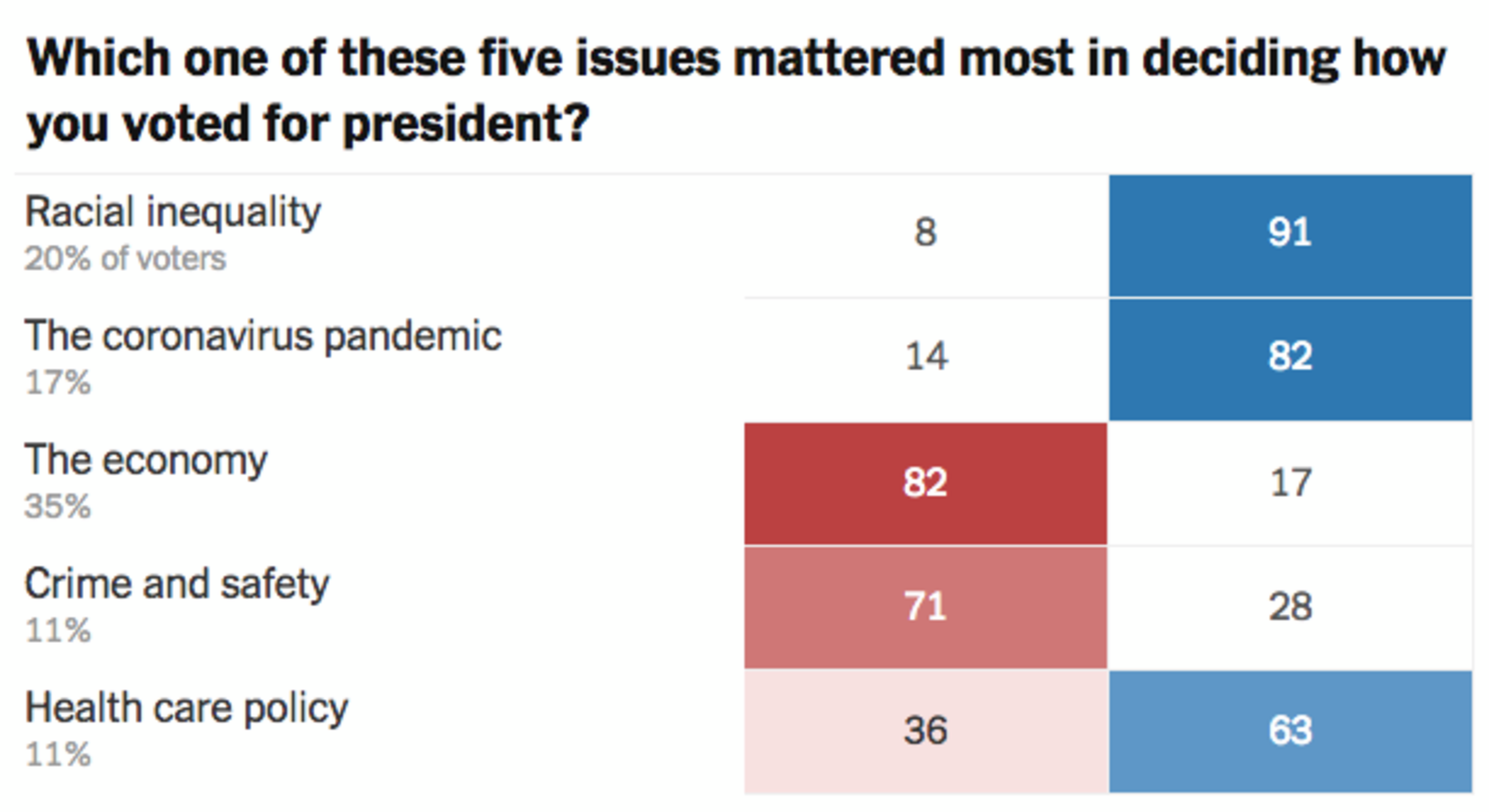 The economic situation was the single biggest factor for American voters (35%, against 11% for law and order and 20% for racism). Yet of those who placed the economy as the main motivation for their vote, 82% opted for Trump, against 17% for Biden.