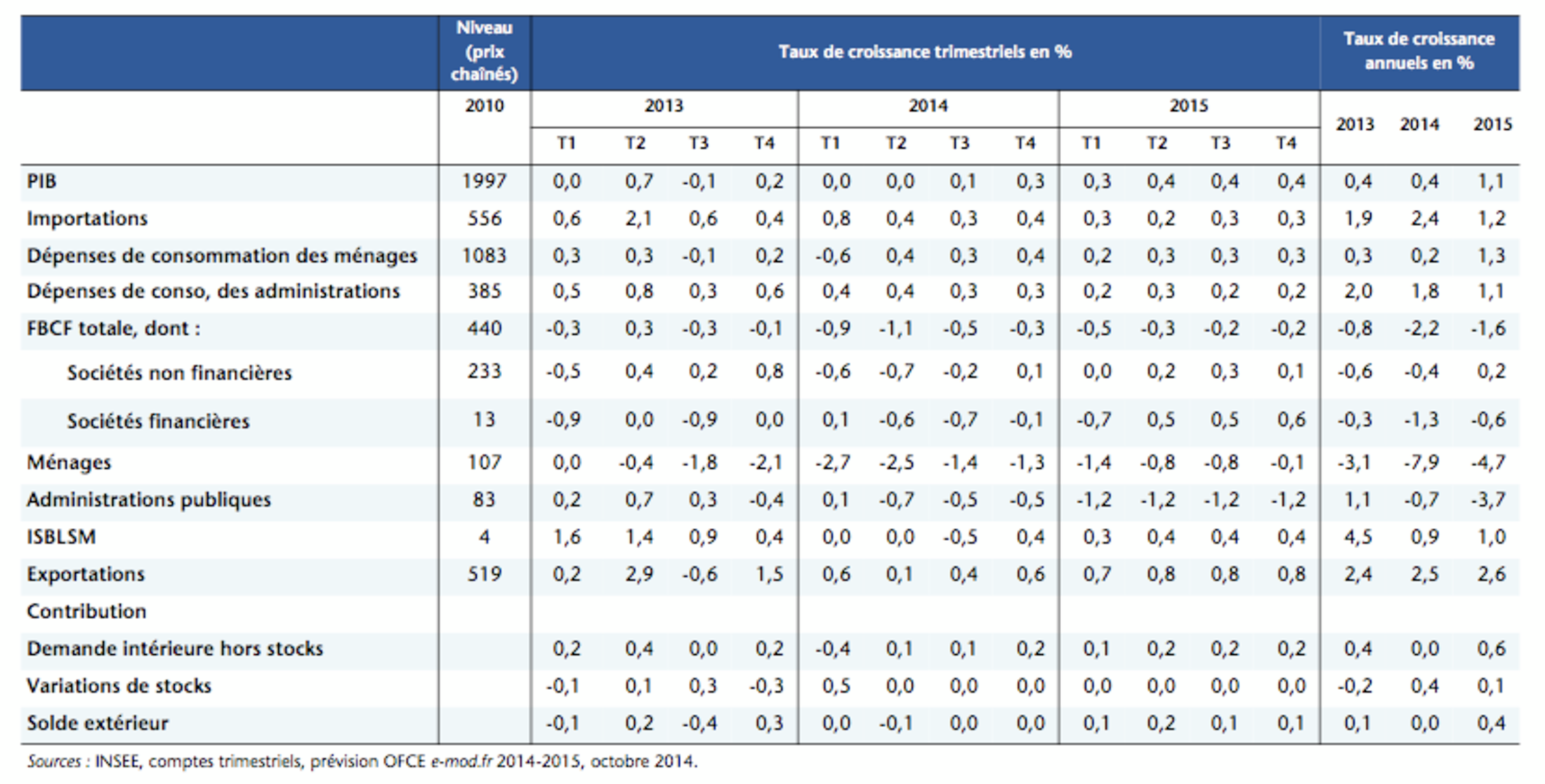 The study's forecasts are not substantially different from those published by other expert bodies – that is, they are just as pessimistic. Looking back, it notes that the recovery that appeared to be getting under way in 2010 ground to a halt in the early months of 2011, and that since then France has been treading water with growth close to zero. Nor does the study, published on October 29th, 2014, find any indication that a recovery is in the offing.