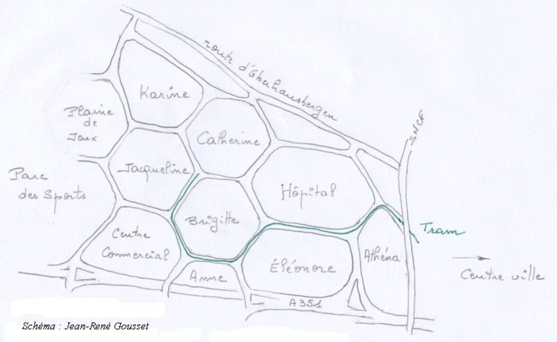 One of three Strasbourg sink estates now undergoing a facelift, Hautepierre, was built in the early 1970s on a hexagonal grid, with residences and pedestrian areas bounded by roads with angles of 120° so that cars could drive through at a constant 60 km/hour (about 37 miles per hour). The only side roads were dead-ends provided for parking.