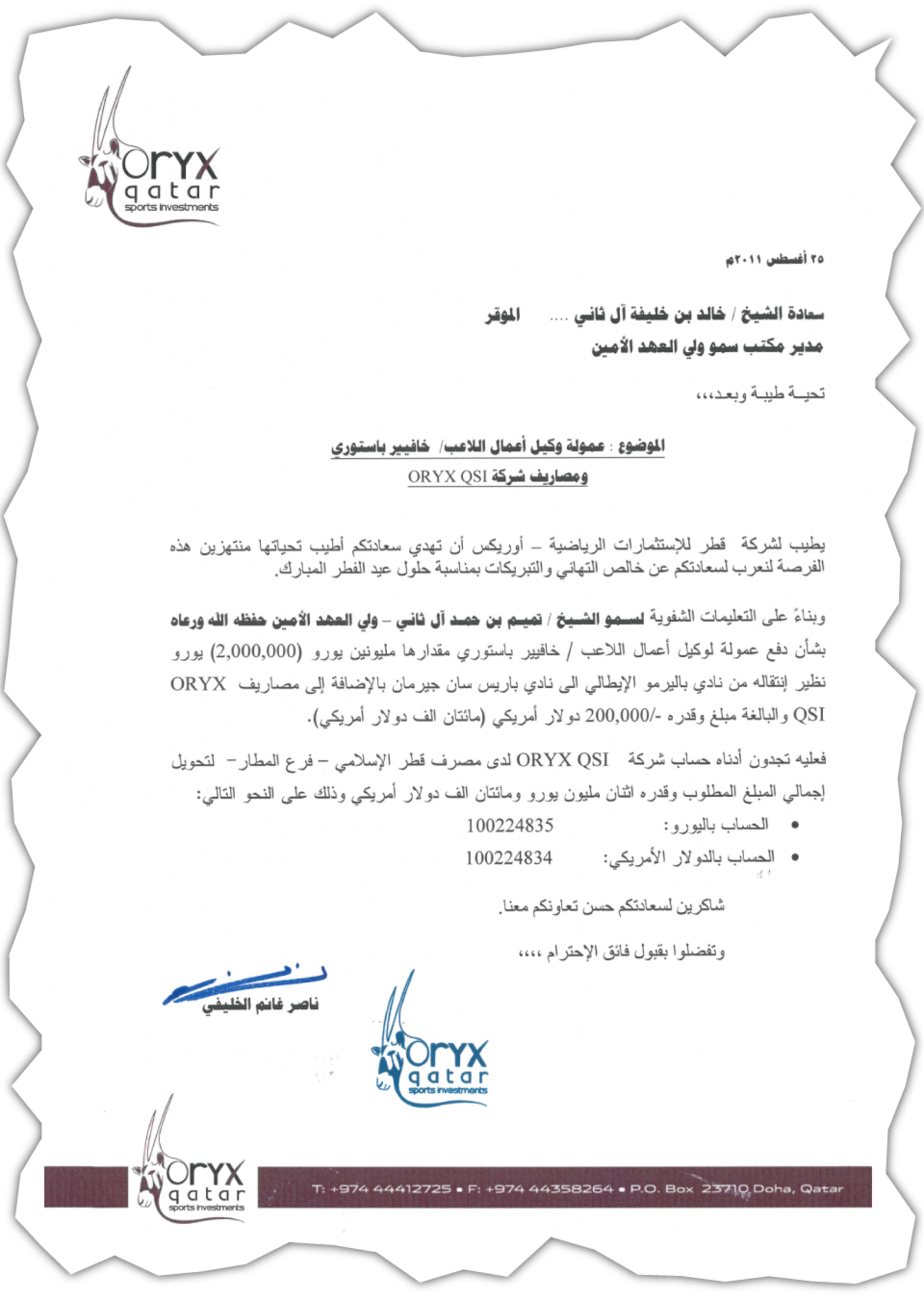 Nasser Al-Khelaifi writes that the content of his letter is “based on verbal instructions given by His Highness Sheikh Tamim bin Hamad Al Thani, heir to the throne, may God protect and conserve him, regarding the payment of the commission due to the agent in charge of the player Javier Pastore amounting to 2 million euros in exchange for his transfer from the Italian club of Palermo to Paris Saint Germain, in addition to the expenses of Oryx QSI, amounting to US $200,000.”