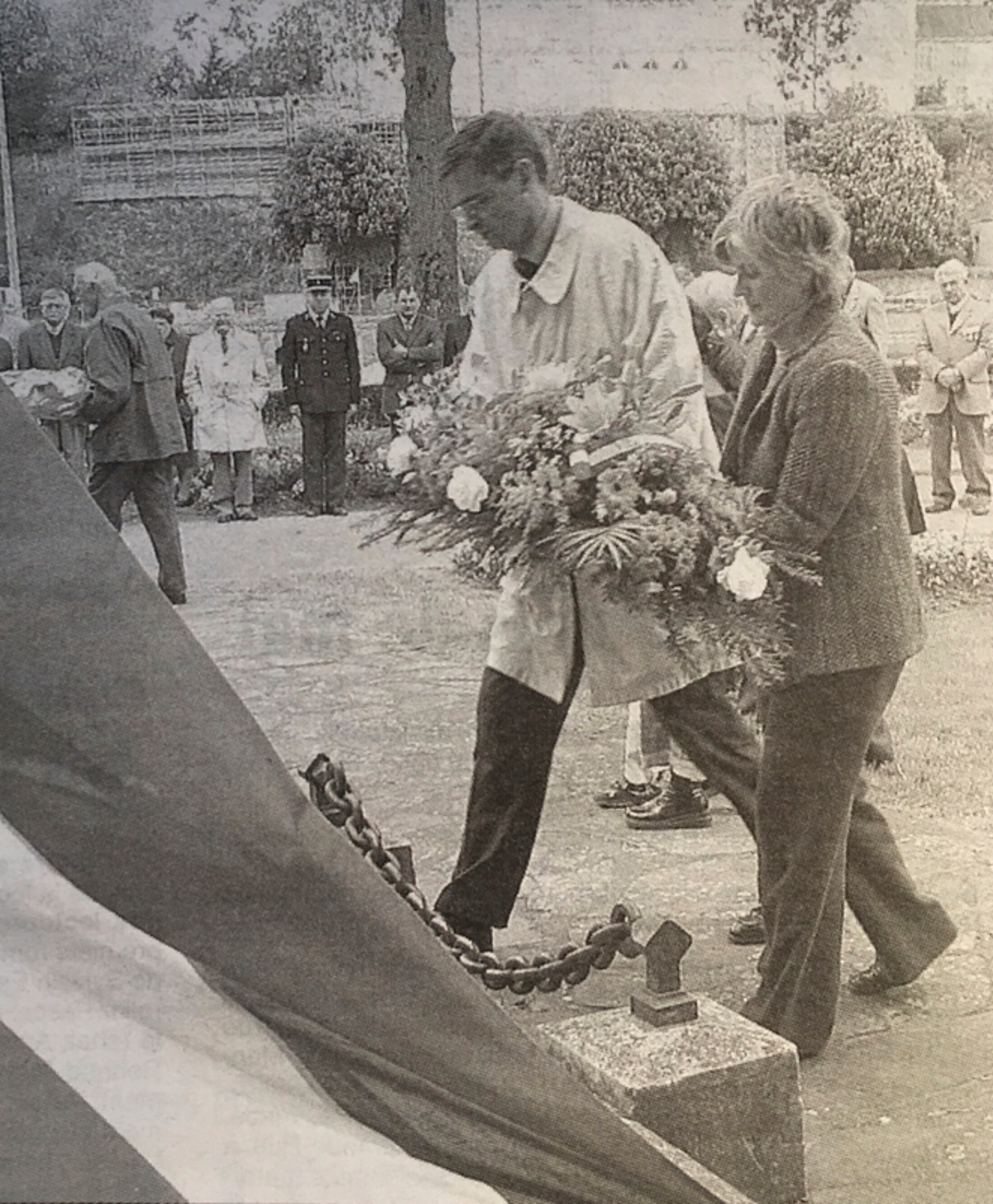 Just a few months later, on VE Day, May 8th 2004, Les Nouvelles de Sablé reported that Penelope Fillon attended a commemoration ceremony for former Sablé WWII prisoners of war, which followed a celebration of mass in the local Notre-Dame church. “Marc Joulaud […] and Penelope Fillon, who represented her husband kept away by ceremonies in Paris […] laid wreaths at the war memorial,” the paper reported. Two photos captured her apparently rare public presence alongside her employer at the ceremony.