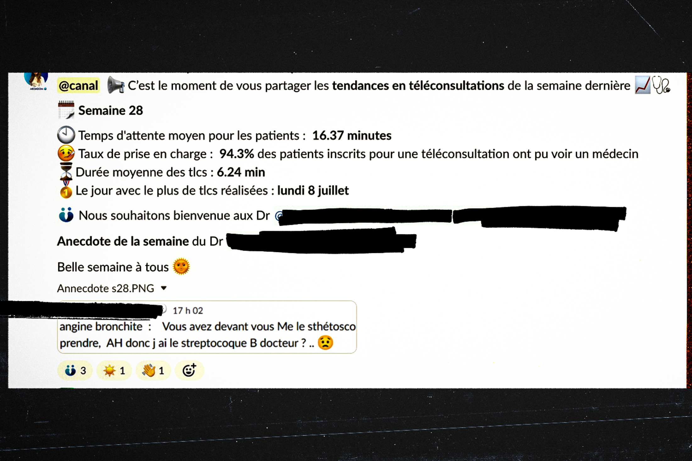 According to Mediapart's information, doctors at Medadom are also overseen by “medical business managers” who regularly review their activity – specifically, the “business” side of things. On top of this they frequently receive messages providing updates on overall activity. For instance, in one of these communications, which Mediapart has seen, the average duration of teleconsultations (“tlcs”) during week 28 was reported as 6.24 minutes.