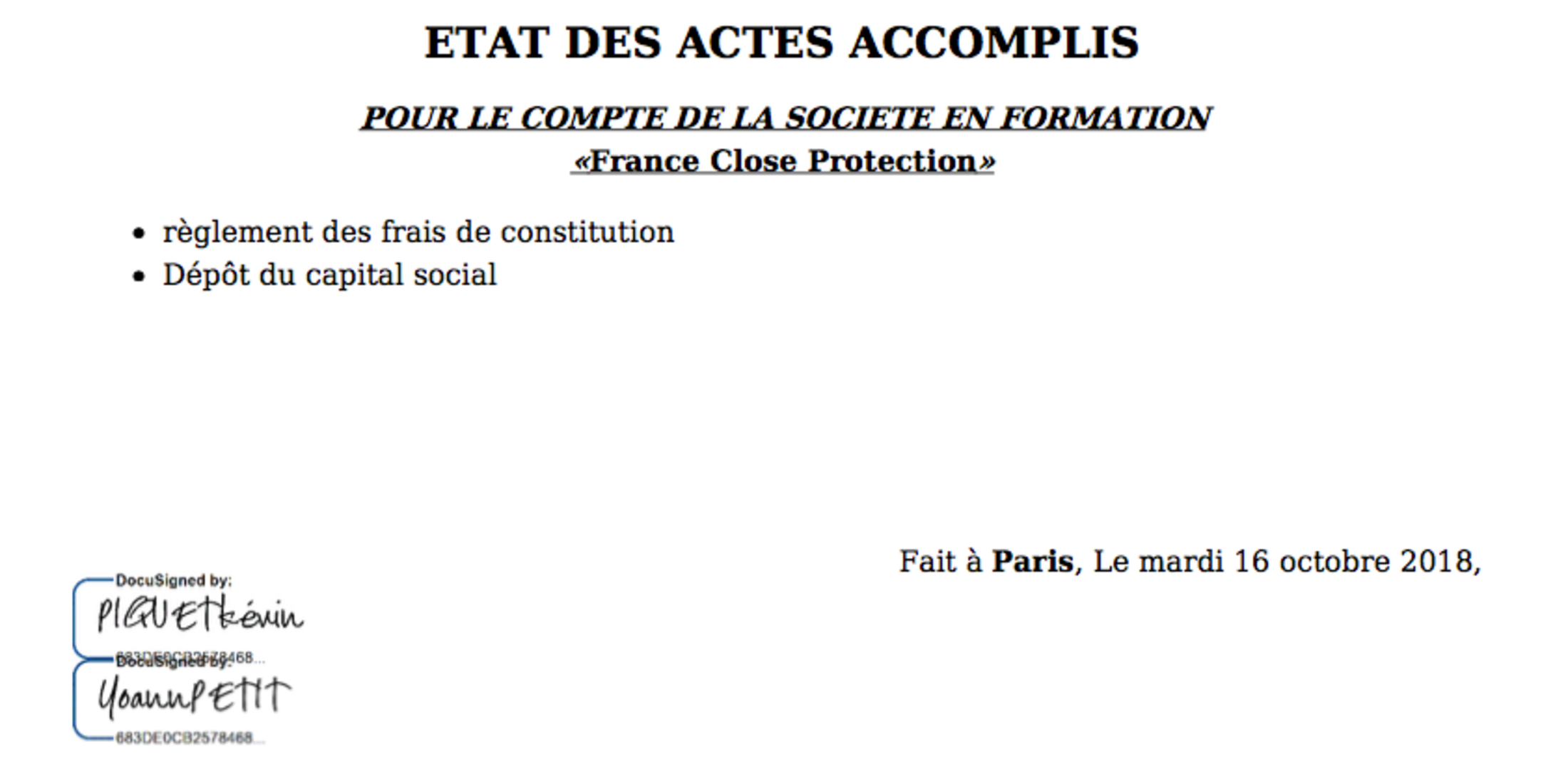As Mediapart has previously revealed, Alexandre Benalla is secretly active behind a company called France Close Protection, which last October obtained a contract to provide personal security services with Russian billionaire Iskander Makhmudov, worth a total of 980,000 euros. According to its official paperwork, the company was created by Benalla’s 18-year-old half-brother Kevin Piquet, and is presided by one of Benalla’s friends, a 44-year-old former French soldier called Yoann Petit. But according to graphologist Christine Jouishomme, on the company documents filed with the French commercial court (see below), the signatures of both men were signed by the same hand (using the online signature application DocuSign).