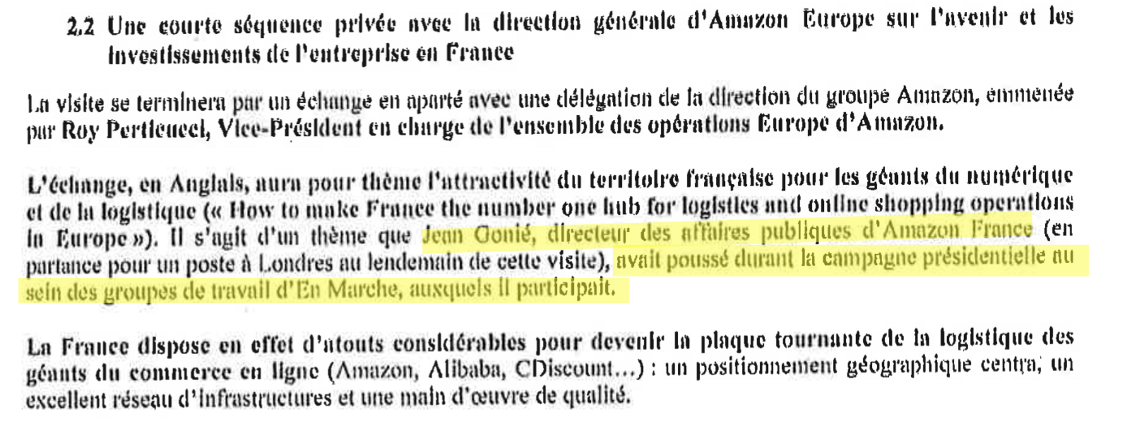 These documents also show the background to public announcements and shed light on the relations between lobbyists and presidential advisors, revealing a striking similarity with the Uber case. The 'Uber Files' revealed that lobbyist Mark MacGann worked in Emmanuel Macron's election campaign team in 2017. And the documents now obtained by Mediapart show that another lobbyist, Amazon's Jean Gonié, also took part in that same campaign. He “pushed” the theme of France being transformed as a leader in online commerce and logistics “during the presidential campaign in working groups for [Macron's party] En Marche in which he took part”. This is revealed in a report from Fabrice Aubert, an Élysée adviser on 'institutions, public action and digital transition', to the president (see below).