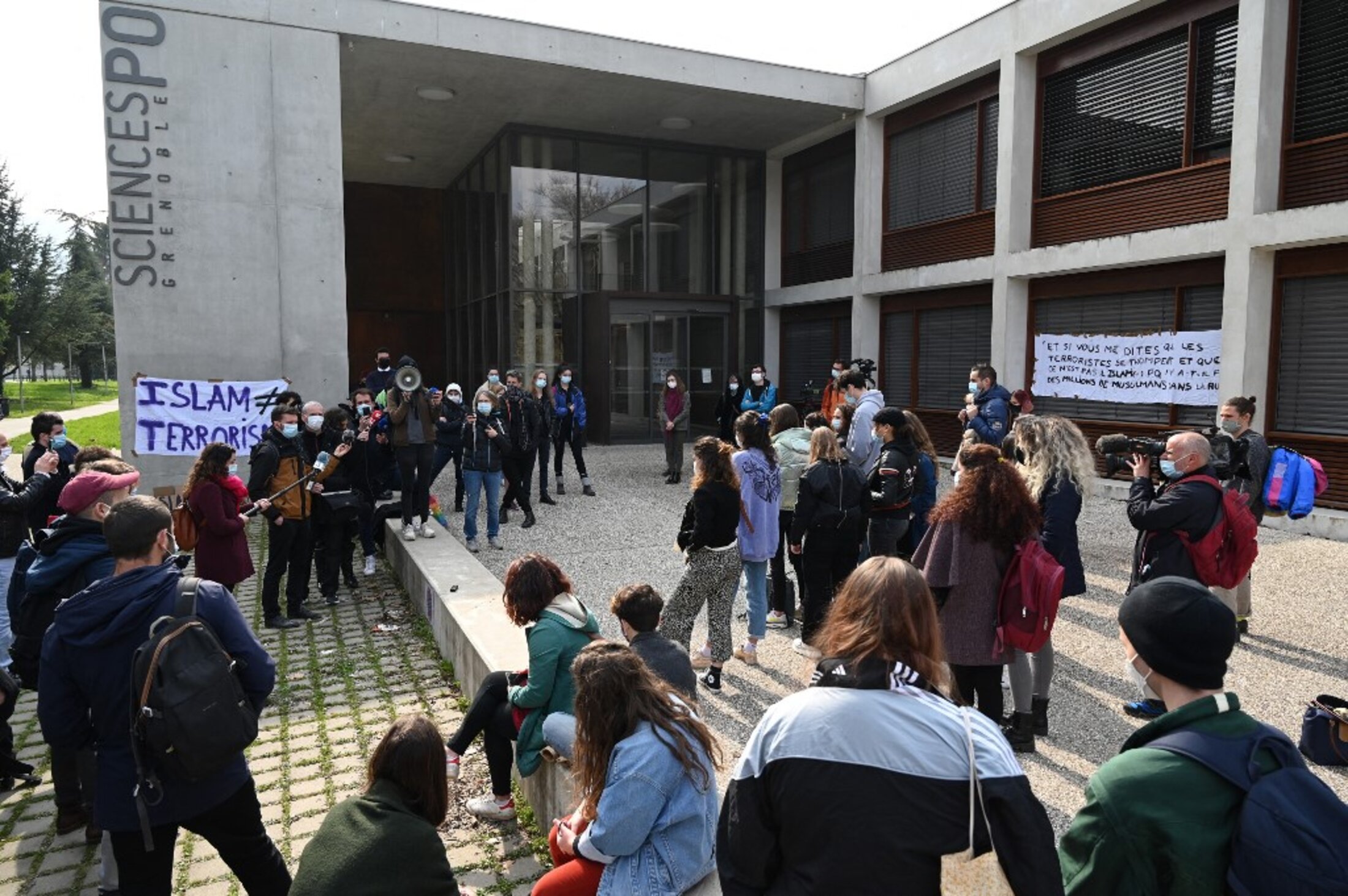 The controversy at the IEP in Grenoble had already been building in the media when, on March 9th, around 20 students gathered at midday outside the entrance to their establishment. They had taped a banner on a wall which read “Islam ≠ Terrorisme”, below which were propped strips of cardboard with the slogans “Racism is an offence” and “Halt to Islamophobia”.