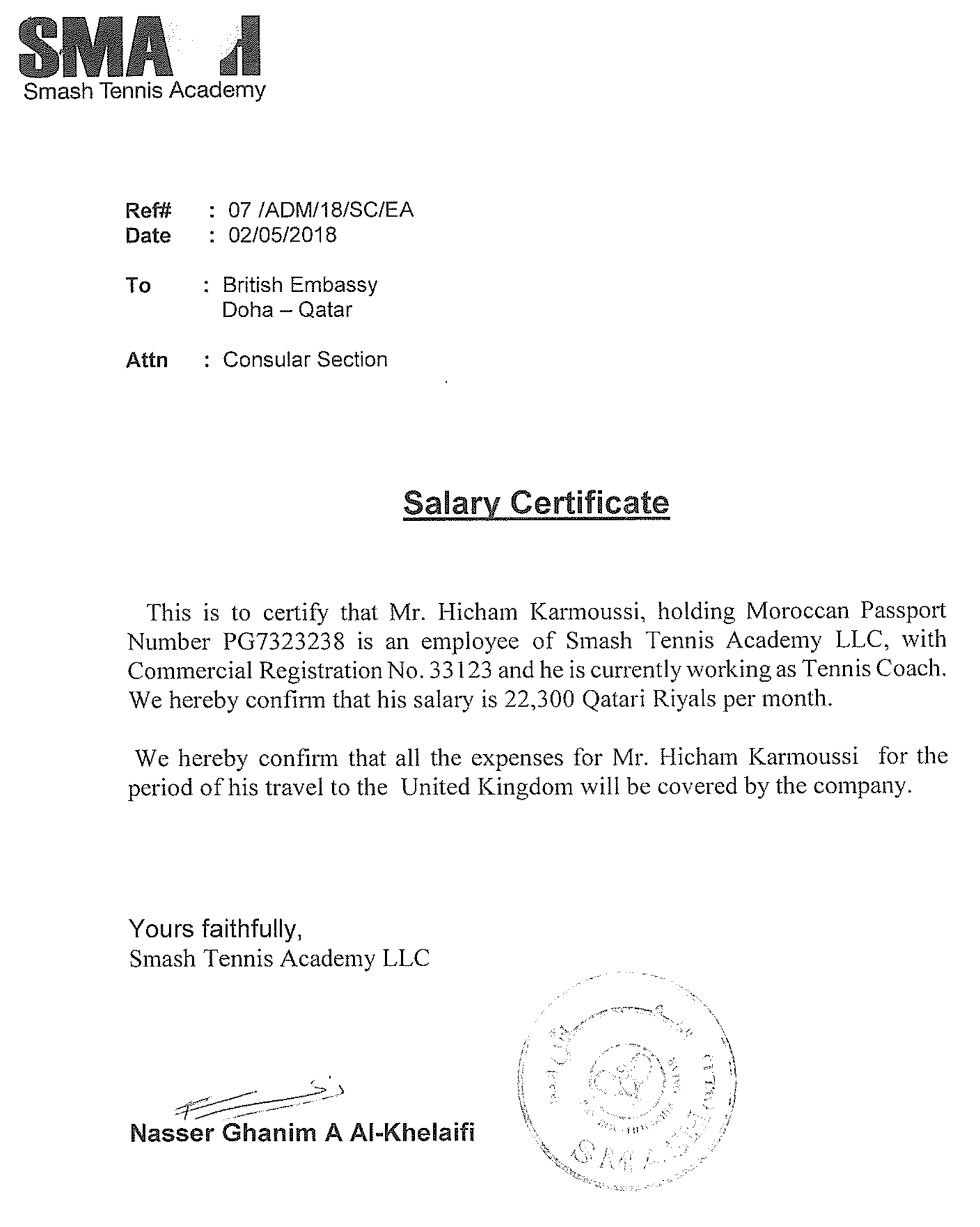 Meanwhile, Karmoussi continued to be paid by the Smash Tennis Academy in Qatar. In May 2018, Khelaifi signed a document sent to the consular services at the British Embassy in Doha to obtain a visa for Karmoussi to visit Britain. Entitled “salary certificate”, it certified that “Mr Hicham Karmoussi […] is an employee of the Smash Tennis Academy” where “he is currently working as Tennis Coach”.