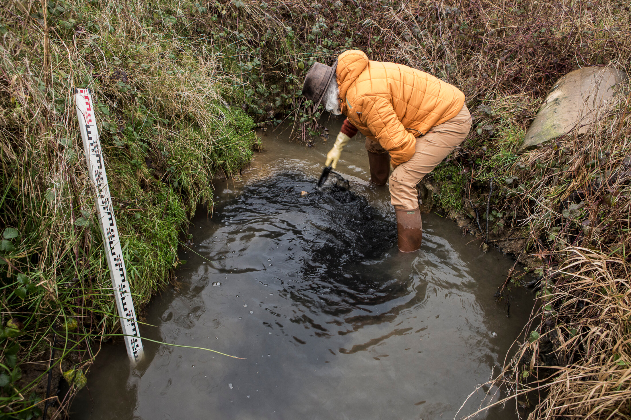 Armed with just a shovel and a water measuring stick, the fisherman walks across the field until he reaches the Roglain, a small stream which feeds into the River Sarthe in northern France. Once in the middle of the stream he agitates the mud with his boots and then waits. Within a few seconds the water has taken on a blackish hue.