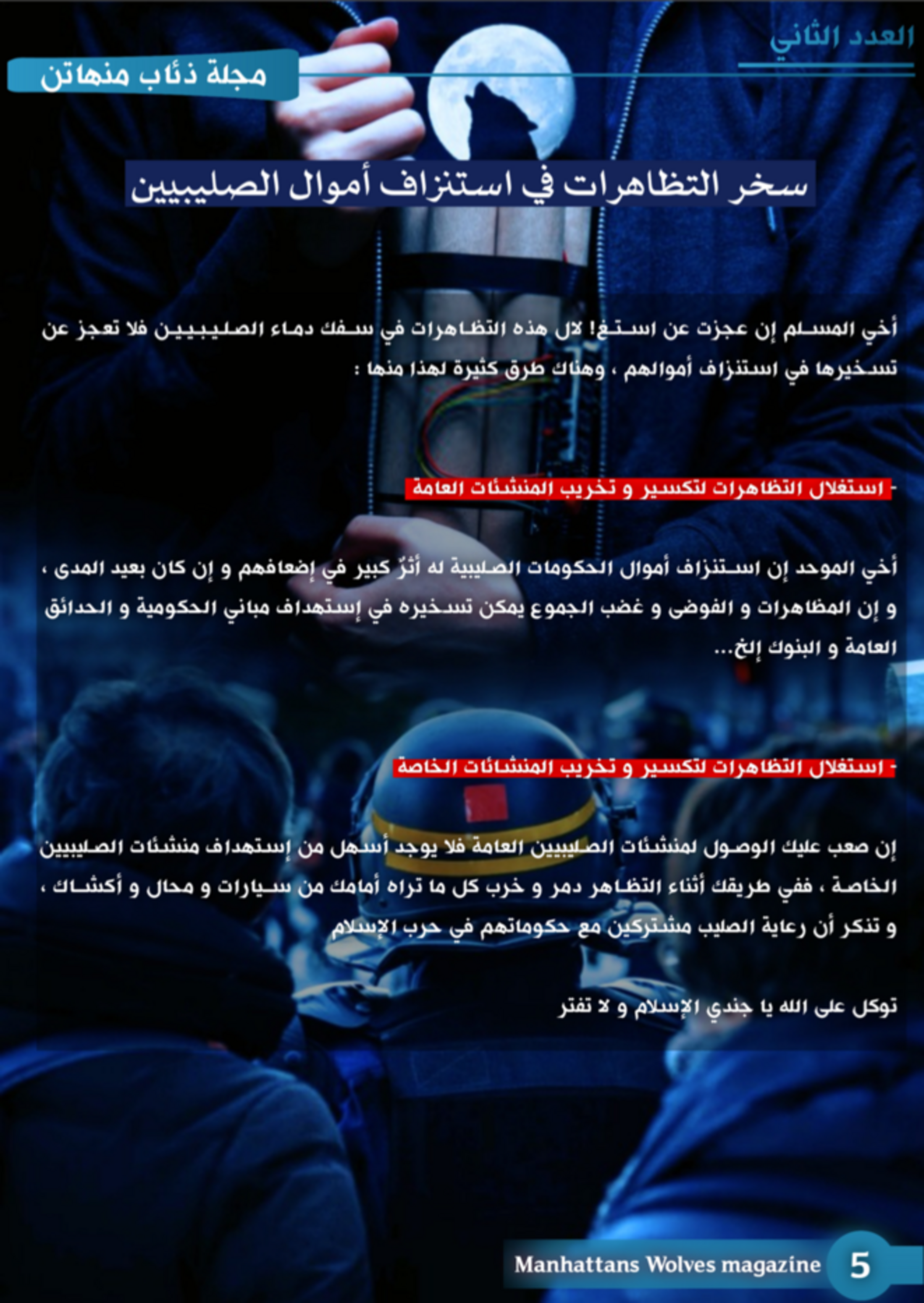 On April 14th this year Manhattan Wolves, a jihadist propaganda magazine, published its second issue. As the organisation MEMRI, a non-governmental body that monitors Islamic media, pointed out, this online magazine which supports Al Qaeda and which describes itself as a “guide for lone wolves in Crusader countries”, called on followers to kill police officers. The magazine also carried an announcement of a 60,000-dollar reward in bitcoin for the first person to kill a police officer in a Western country. The cover photograph is the rear view of a police officer during an operation to maintain law and order. That police operation is in France.