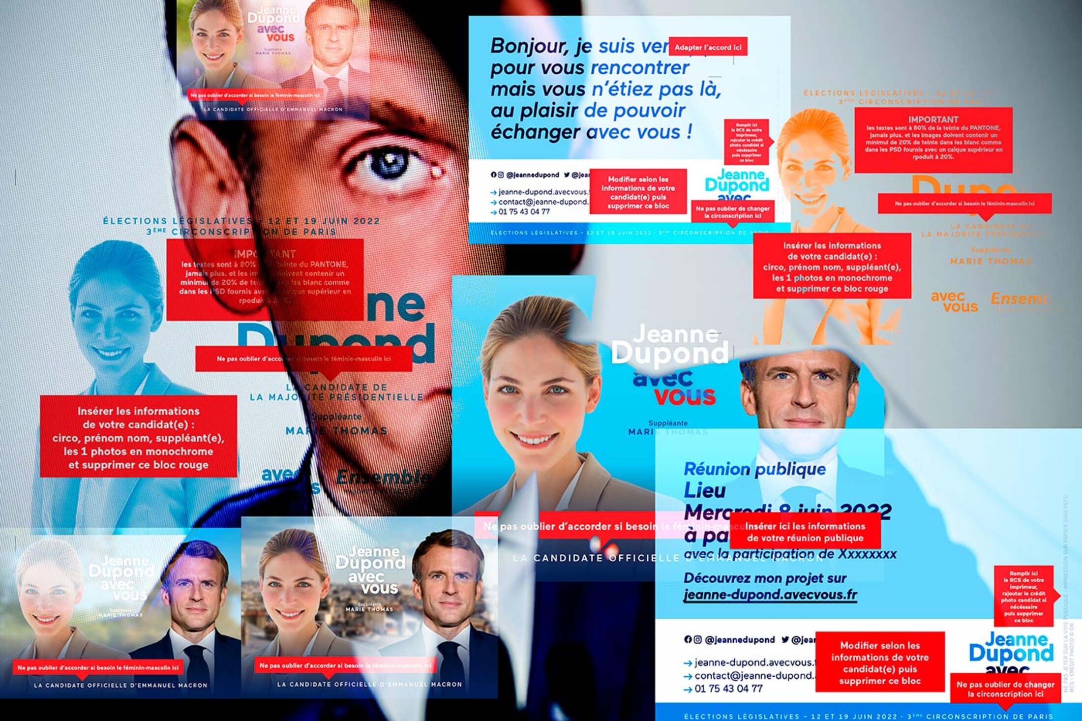 This campaign literature, seen by Mediapart, bears an uncanny resemblance to the model documents used in 2017 with such evident success; Macron' party and its allies won 350 of the 577 National Assembly seats at that election. They feature Macron's image next to 'Jeanne Dupont' and their substitute 'Marie Thomas', with the actual names and images to be filled in by the candidates and their replacement (in elections for the National Assembly candidates nominate a substitute or 'suppléant' who would take over from them in case they are made a minister or are unable to continue in office).