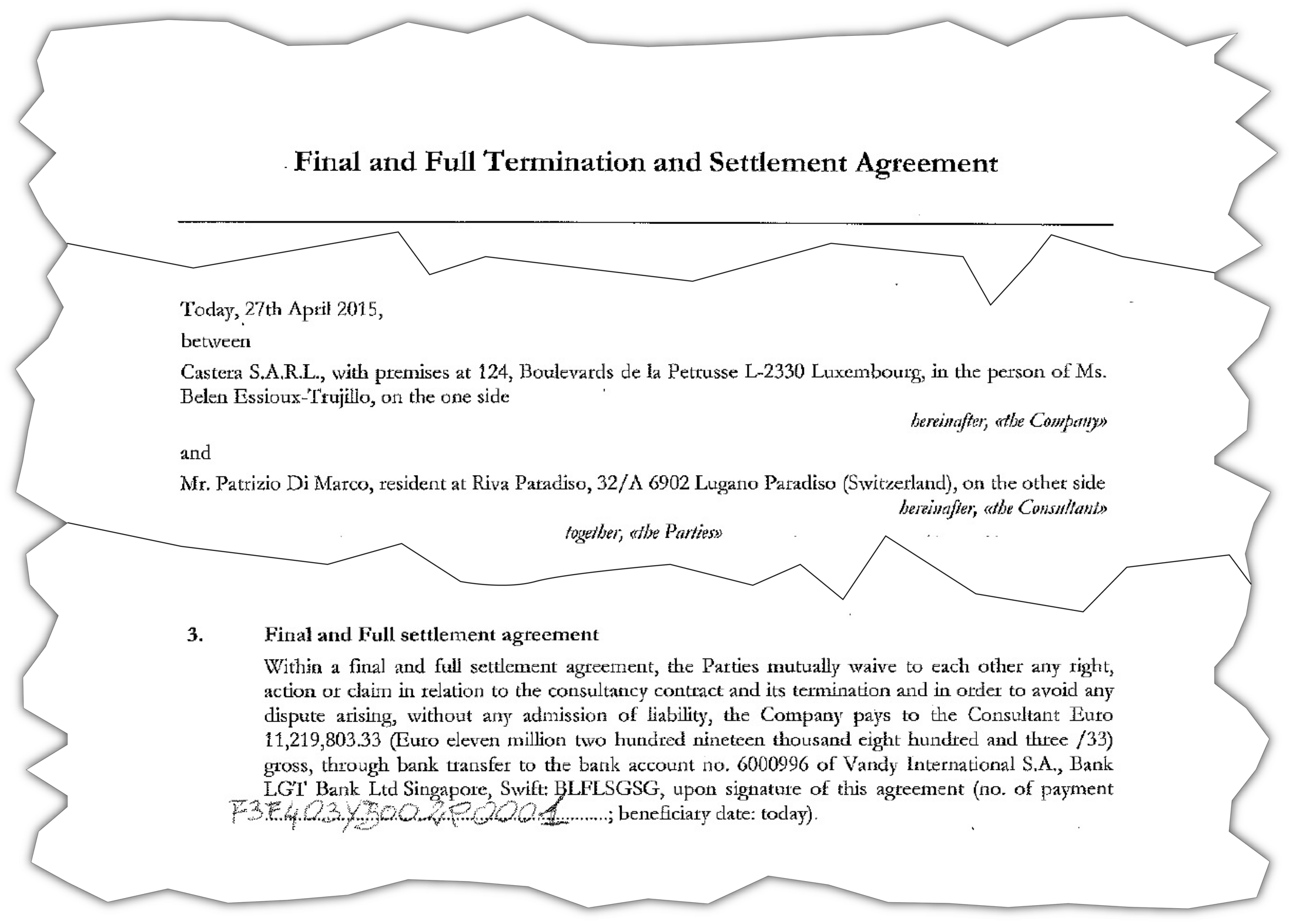 When he was removed from Gucci by François-Henri Pinault in 2014, Di Marco negotiated a colossal severance package: free Kering shares worth 1 million euros, plus a payment of 11.1 million euros. Once again the money was paid to his company in Panama, via a LGT Bank account in Singapore. The document (see below) was signed by the head of human resources at Kering at the time, Belén Essioux-Trujillo.