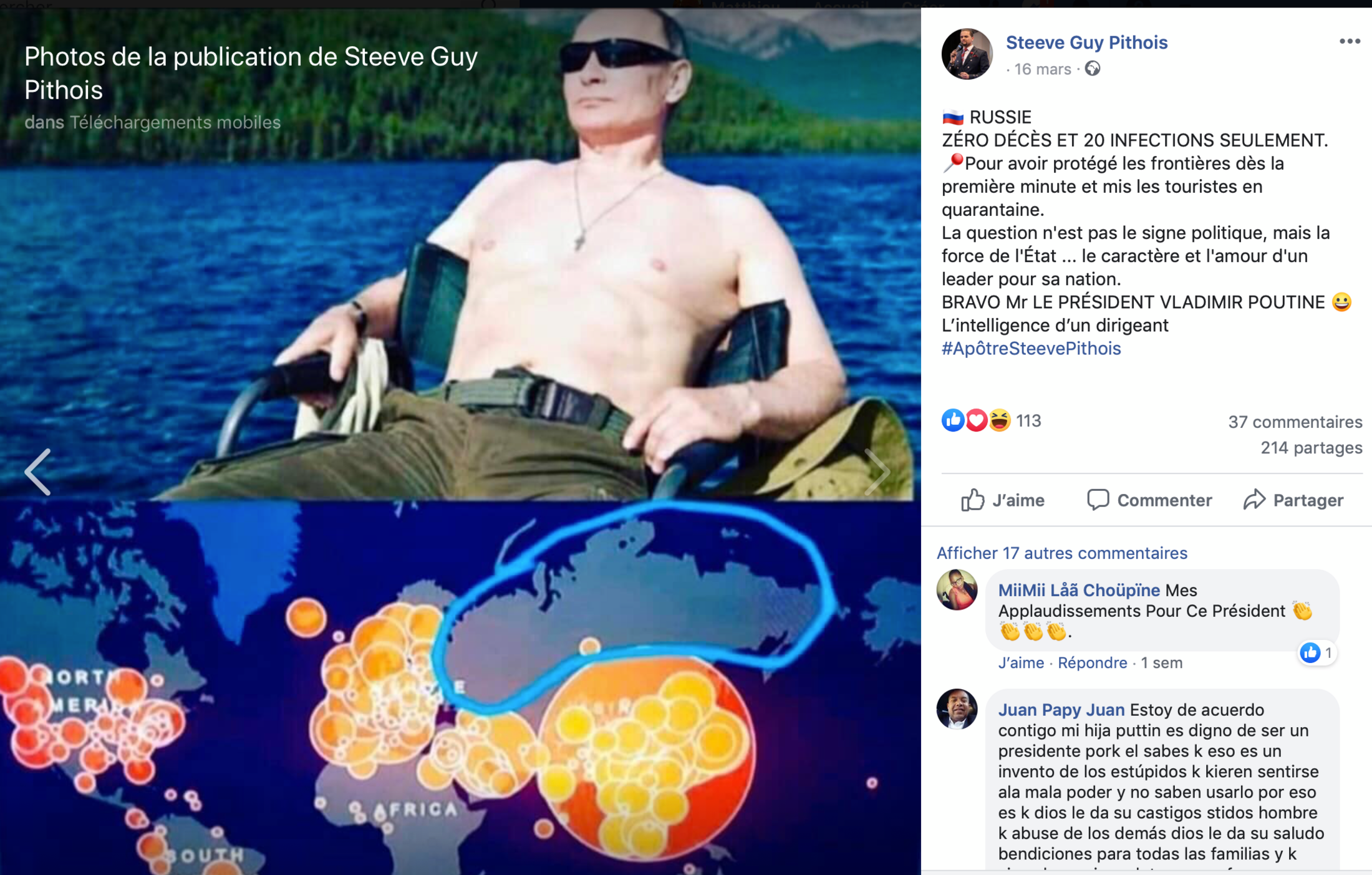 Mediapart's investigations show that the pro-Kremlin propaganda in France has focussed on extolling the “exceptional” way that Russia has handled the pandemic so far. One message reads: “RUSSIA: ZERO DEATHS AND JUST 20 INFECTIONS. Thanks to having protected the borders from the first minute and having put tourists in quarantine.” The accompanying unsubtle image shows Russian leader Vladimir Putin relaxing in the sunshine while an accompanying map shows how the whole of Europe has been invaded by the virus – except Mother Russia. This meme has gone viral in recent days.