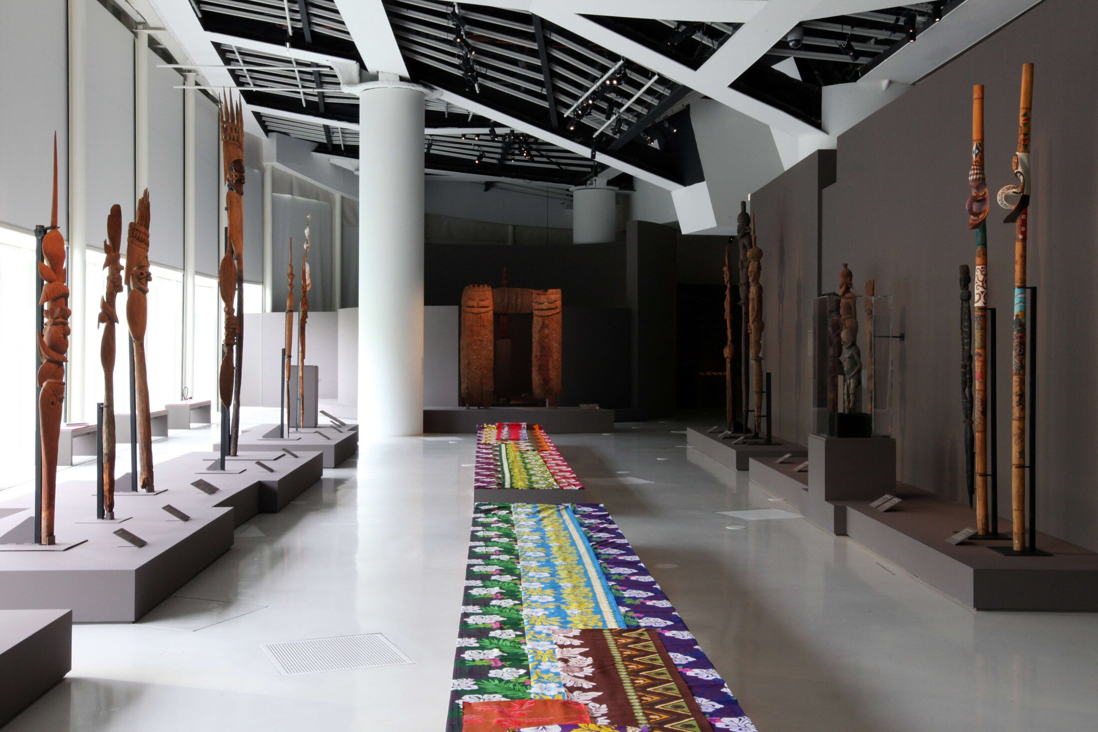 “These are sculptures that adorned the top of huts and which were made by sculptors whose names we know well, whose clan names were well identified, and which were of course taken by the missionaries, sometimes given to missionaries, as a sign of allegiance the flèches faîtières were the political glory of the Kanak villages […]” Bensa explains that the artwork of these carvings is recognised as the work of named individuals, who the population recognise and remember. “The ancient Kanak societies were not authorless societies but quite the opposite, very, very individualized […] each person has his own things to tell.” The European-made cloth in the middle of the room is an example of what the missionaries brought with them and which they often used as extra covering for Kanak girls and women who they judged insufficiently and immodestly dressed.