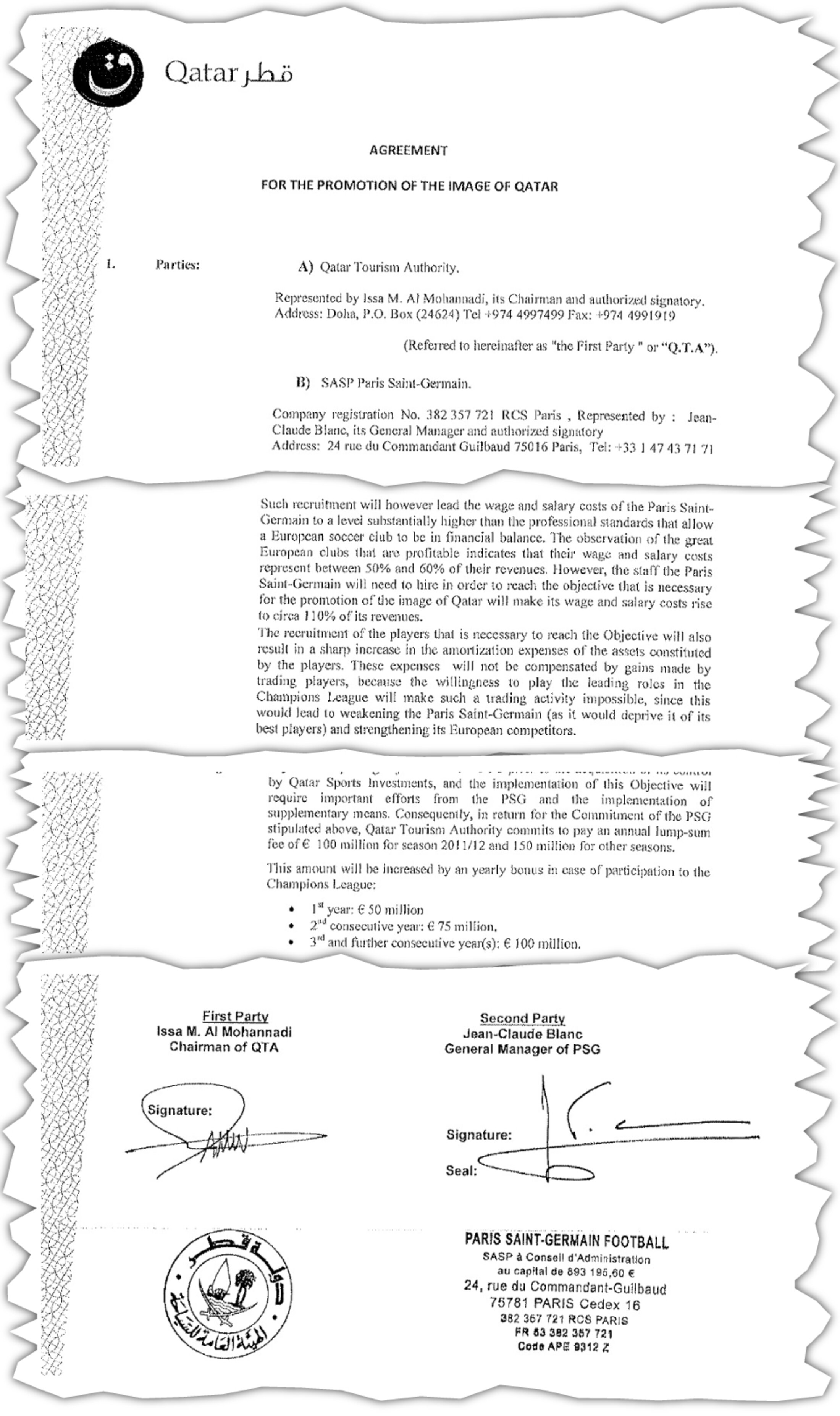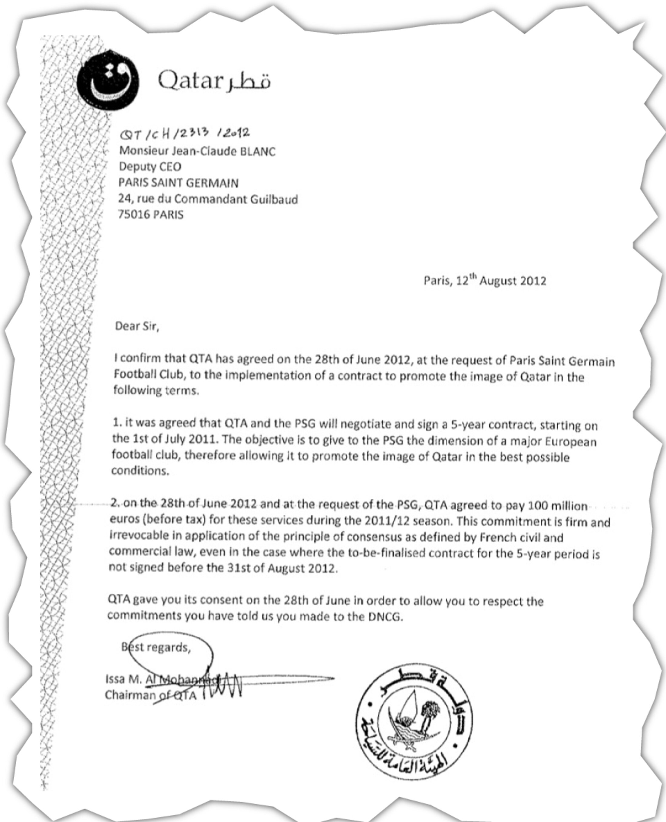 In June 2012, the Qatari-owned PSG ended the season at the top of France’s top-flight division Ligue 1. As a result, the club was among the teams qualified for the Champions League, and was required to abide by the financial fair play rules. Two months later, and in all secrecy, PSG signed a contract with the state-run Qatar Tourism Authority (QTA) for the “promotion of the image of Qatar”. Under the terms of the contract (see document immediately below), the QTA was to give PSG 1.075 billion euros over five years – an average of 215 million euros per year – with 100 million euros in the first season, and up to 250 million euros the following years.