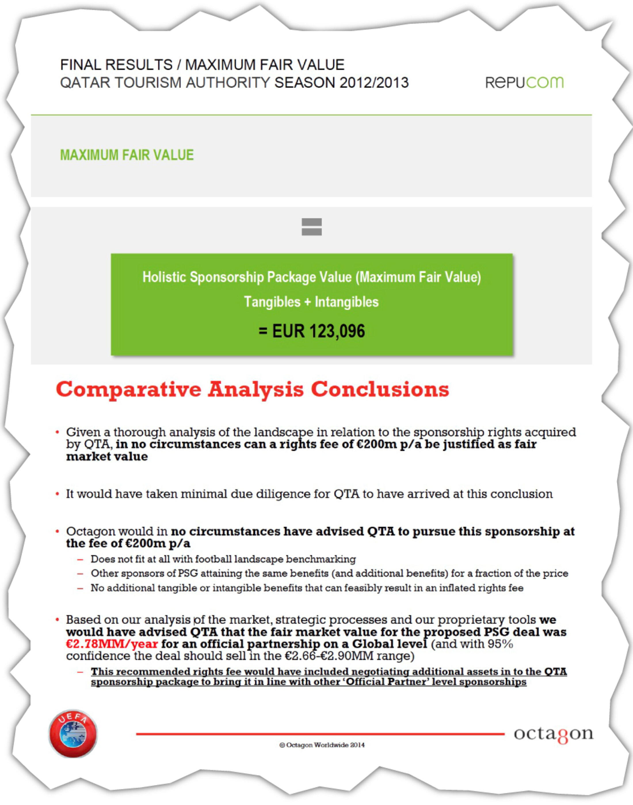 On April 8th 2014, a lawyer for UEFA's CFCB investigatory chamber drew up a final report which was to be signed by the body’s chief investigator. The document concluded that the QTA contract was not only “massively overvalued” but also that it had been conceived “to circumvent the rules” of financial fair play.