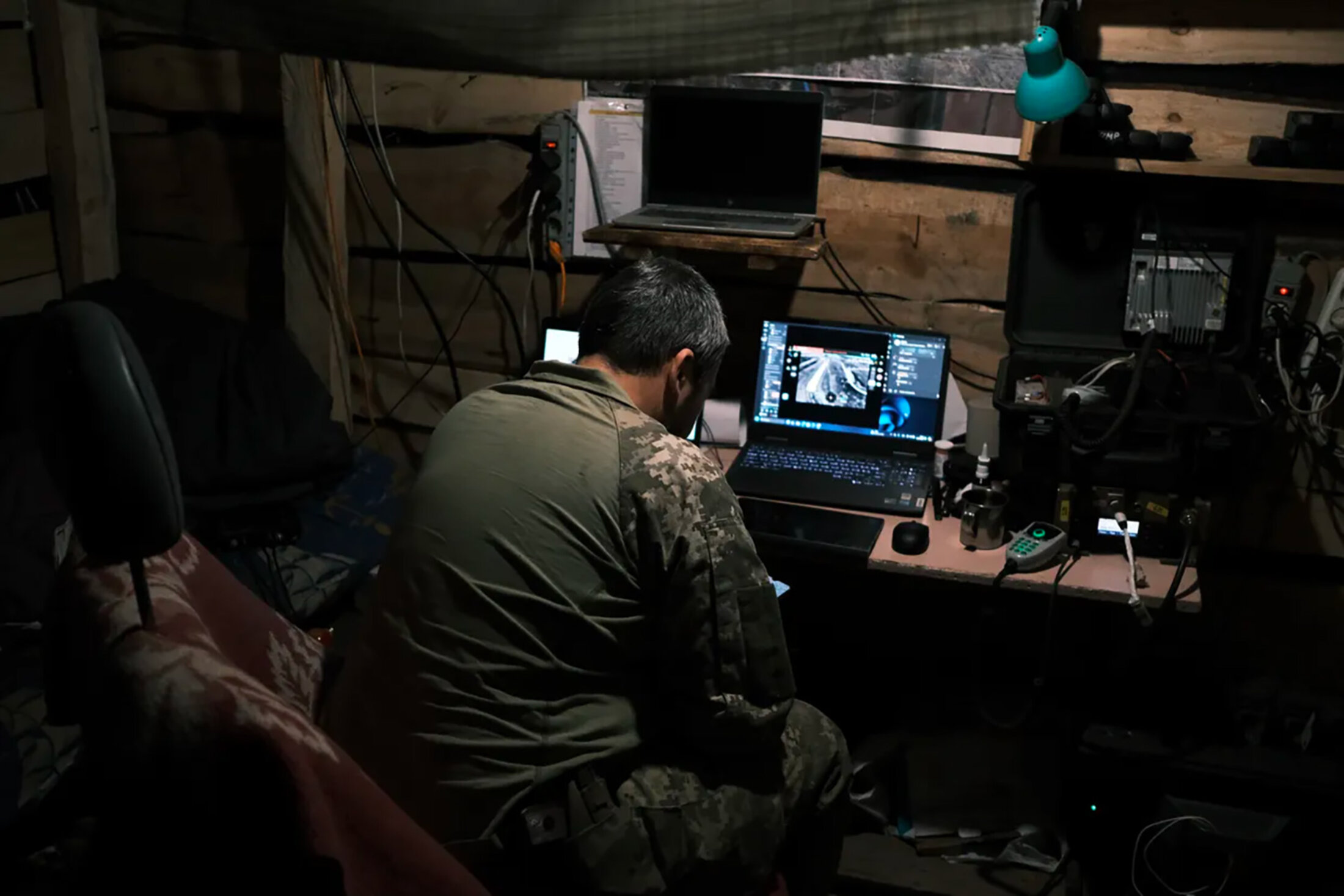 The soldiers quickly send back videos recorded by the gun’s scope; the sound of the intermittent, automated bursts seems almost peaceful in the silent dugout.