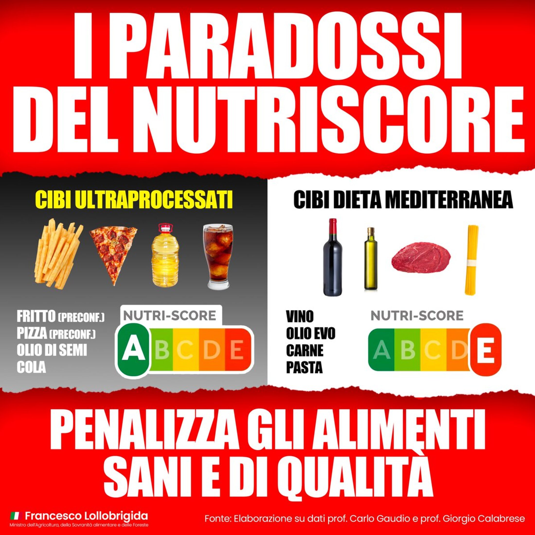 On February 28th 2023 the Italian minister resumed his campaign against Nutri-Score in a Tweet which called for “common sense”. He wrote: “Nutri-Score is an erroneous system. It penalises healthy and quality food.” He then showed ultra-processed foods claiming they received an 'A' with a green background – chips, pizza, seed oil, cola, - while claiming products from the Mediterranean region were being given bad marks with an 'E' set against a red background: wine, olive oil, beef and pasta.