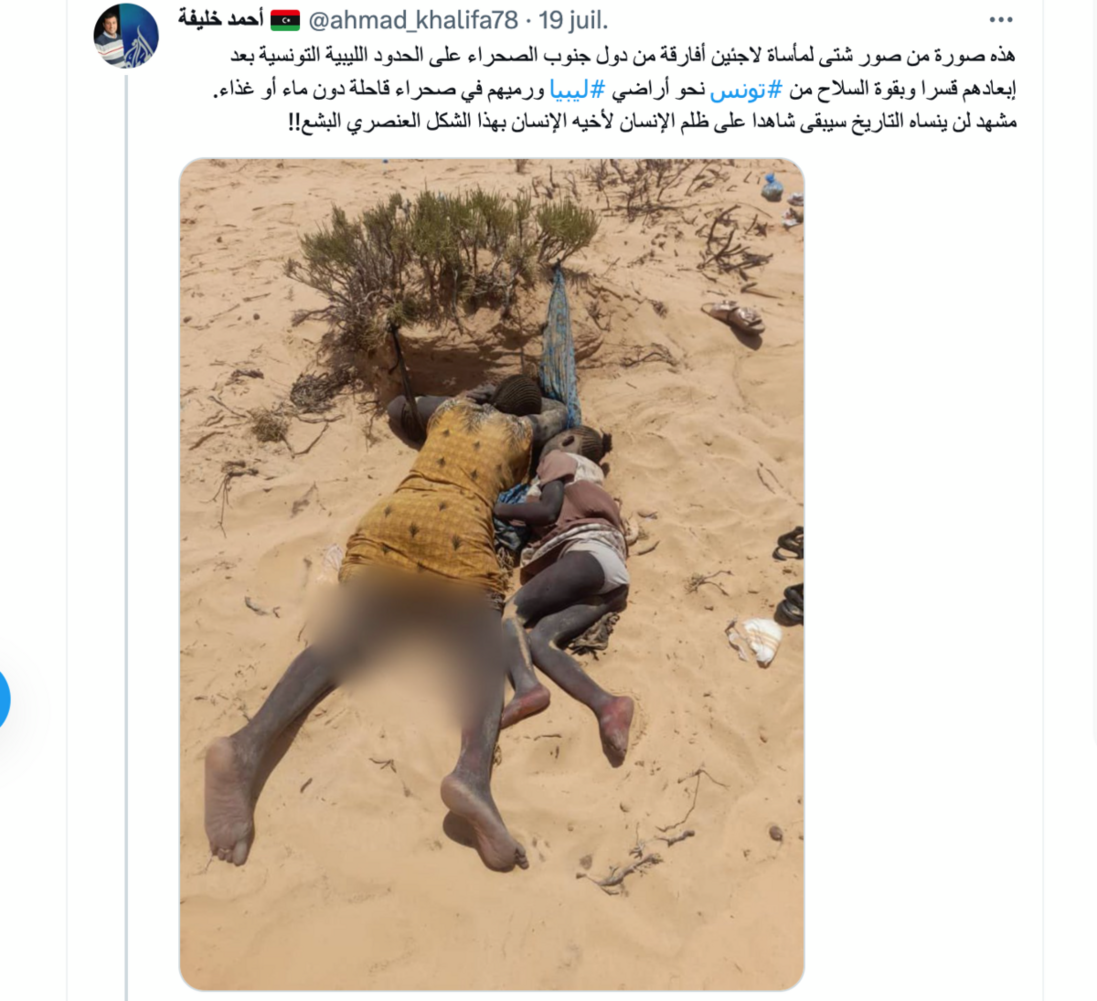 In the AP report dated July 29th, the news agency cited Libyan major Shawky al-Masry, spokesperson for the country’s border guard service, as saying it was officers from its al-Assa station, close to the Tunisian border, who found the bodies that feature in the photo. He gave the agency no further details, including where their corpses were taken.