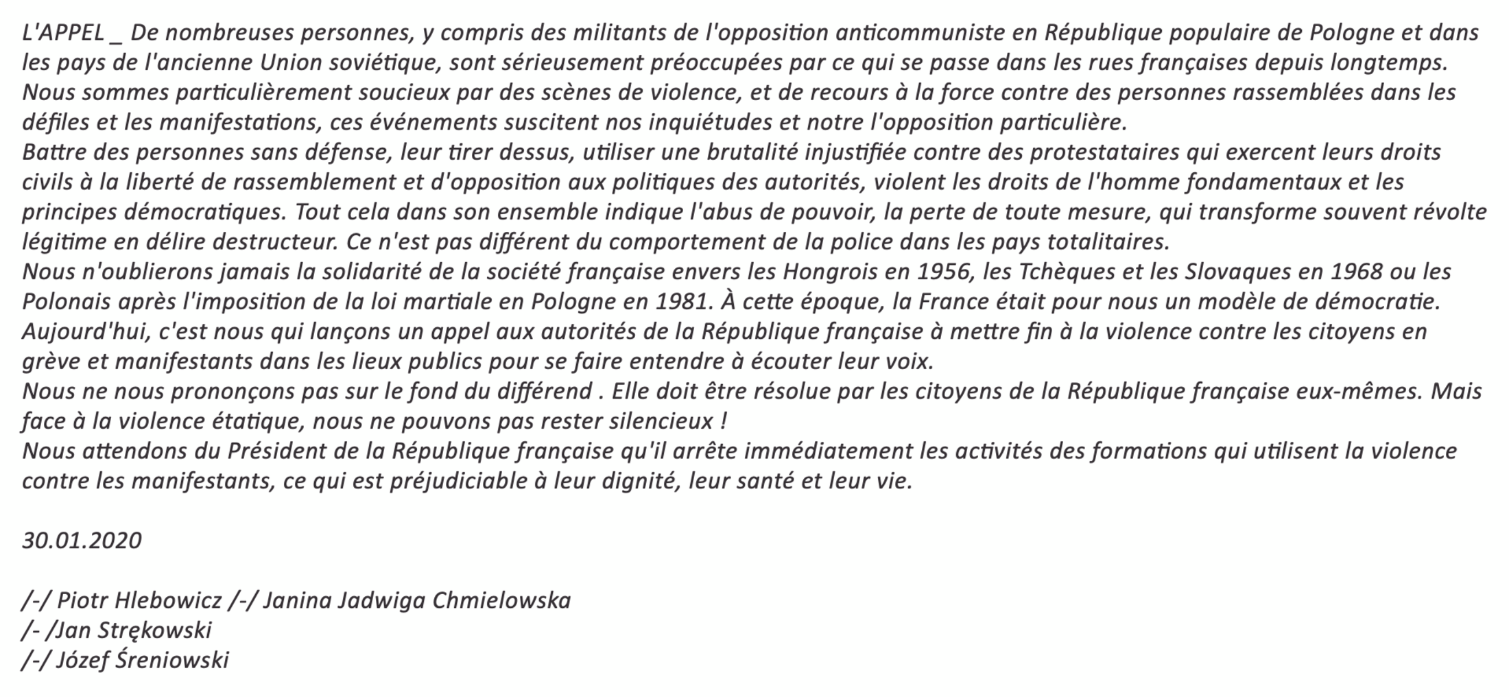 But the French president’s swipe at Poland’s ruling party prompted a swift counter-attack by its members in the European Parliament (MEPs). On Wednesday this week, Polish MEP Jacek Saryusz-Wolski, a former vice-president of the parliament who led the rightwing PiS -Alliance-Solidarity Poland list of MEP candidates in his country in the May 2019 European elections, sent out a caustic email to all his fellow MEPs appealing to them, in its French version, to “sign the petition which the former opponents of the communist regime have addressed to President E. Macron in order to demand him to stop the violence against citizens by the authorities of the French republic”.