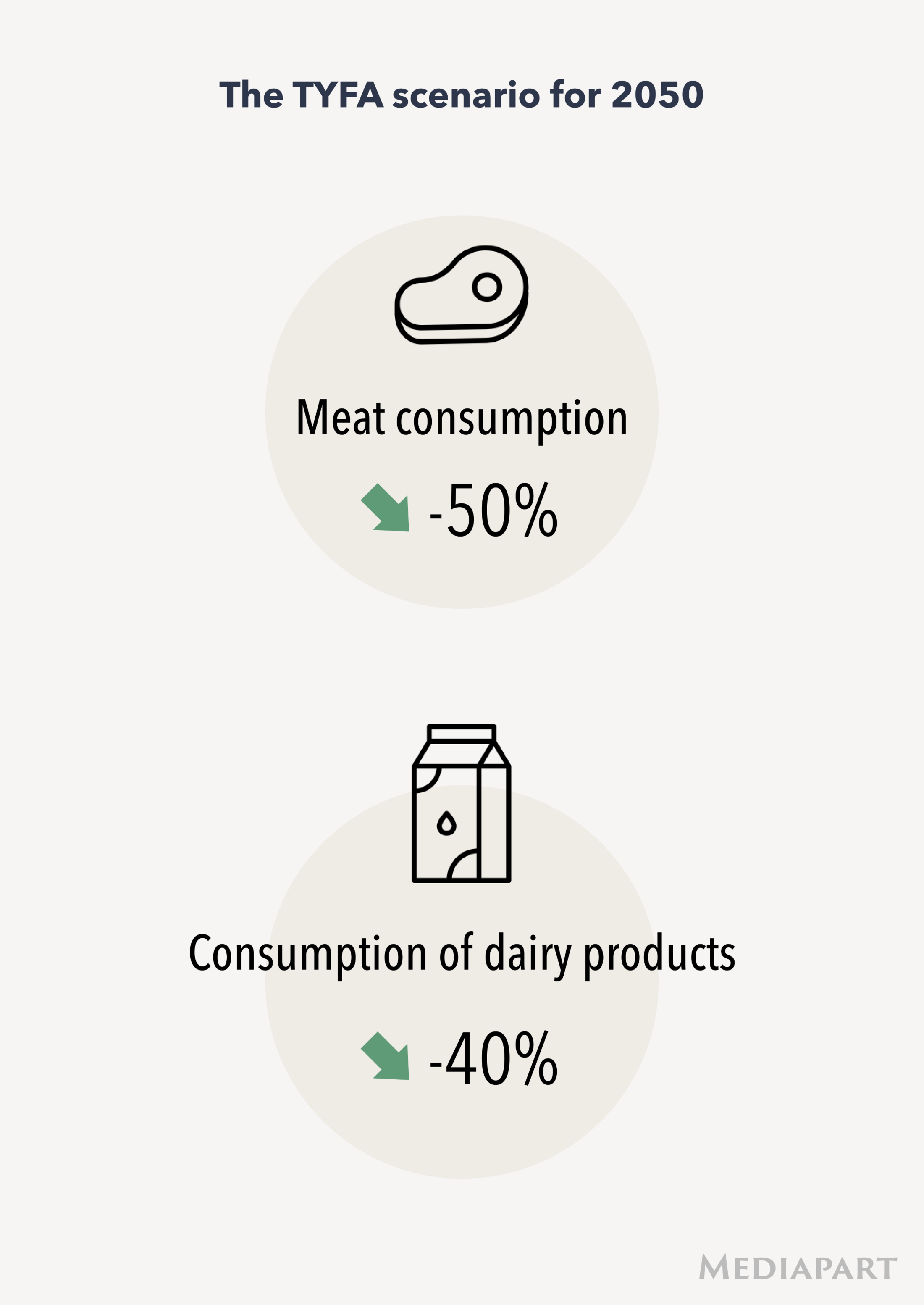 Poux and Aubert underline that the agricultural transformations which they propose would require a seachange in European food consumption habits – less meat and less dairy products, and more vegetable-based protein. The TYFA model projects a reduction of 40% (compared to 2010) in the volume of dairy food consumption, and a 50% cut in meat consumption. Already in France, a trend towards this has begun; according to research by the CRÉDOC, a semi-public association that monitors French consumer habits, the consumption of meat fell by 12% between 2007 and 2016.