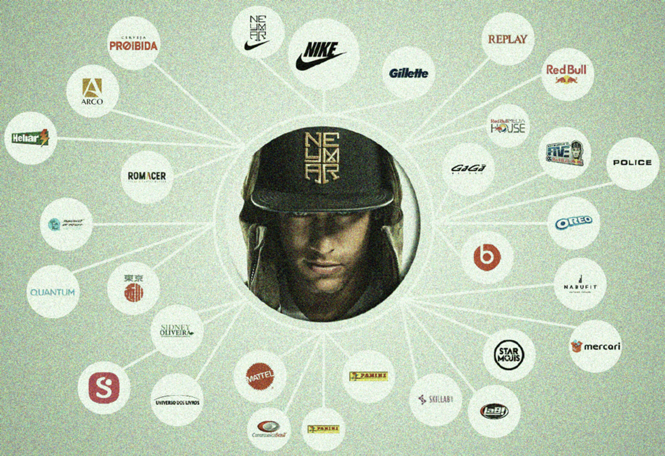 Something of a sandwich man, Neymar has contracts with 30 different sponsors, ranging from sports apparel and accessories firm Nike to Beats headgear, and including energy drink brand Red Bull, Replay jeans, and Gillette razors. His contract with the Police glasses brand earns him a yearly 930,000 euros, according to documents obtained from Football Leaks. In 2015, a deal with snacks and crisps brand Sabritas brought him 869,000 euros for use of his image in Mexico alone.