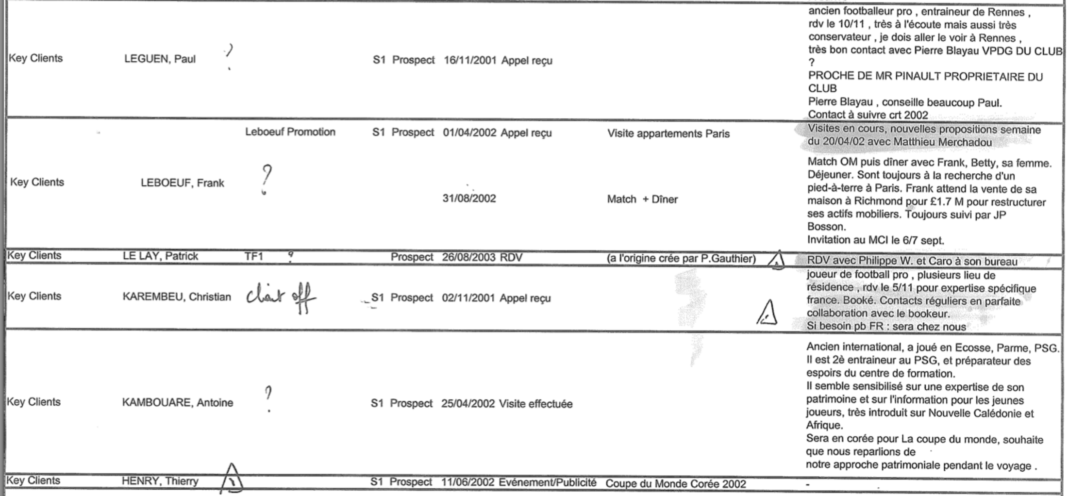 But while these typed observations suggest a quite legal contact with wealthy figures from the world of sport, a handwritten note added against the names of three other former leading French international footballers, Laurent Blanc, Youri Djorkaeff and Christian Karembeu, suggests a less innocent activity. The scrawled note reads “Client off”, in an apparent reference to “offshore” (see below).