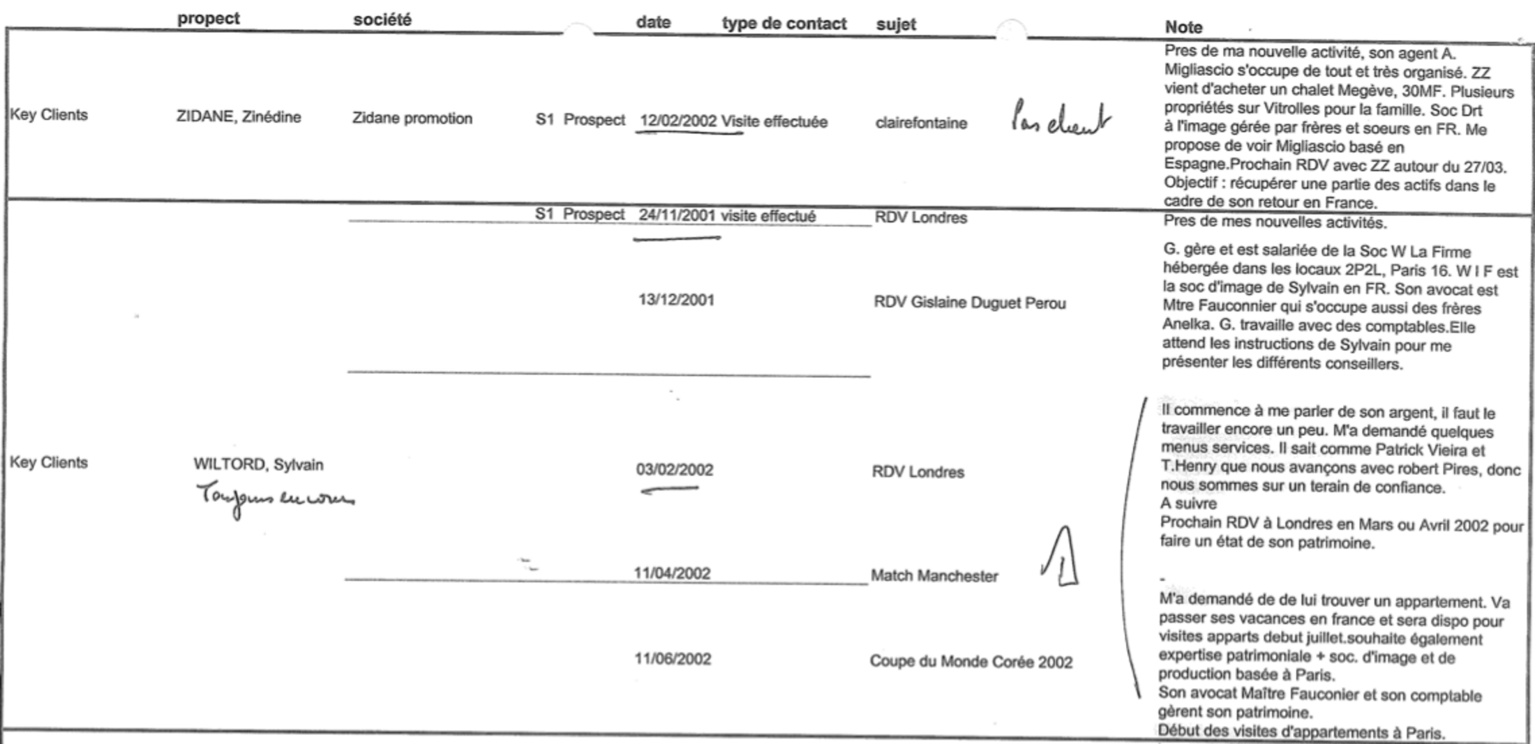 The typed documents include dates and places of contacts, and a right-hand column headed “Note” which details the state of the prospection (see document below). Against the name of Zinedine Zidane, one of France’s most celebrated footballers, who was at the time the notes were written a star player for the Spanish team Real Madrid, appears the comment: “Objective: to recover a part of assets in the framework of his return to France”.