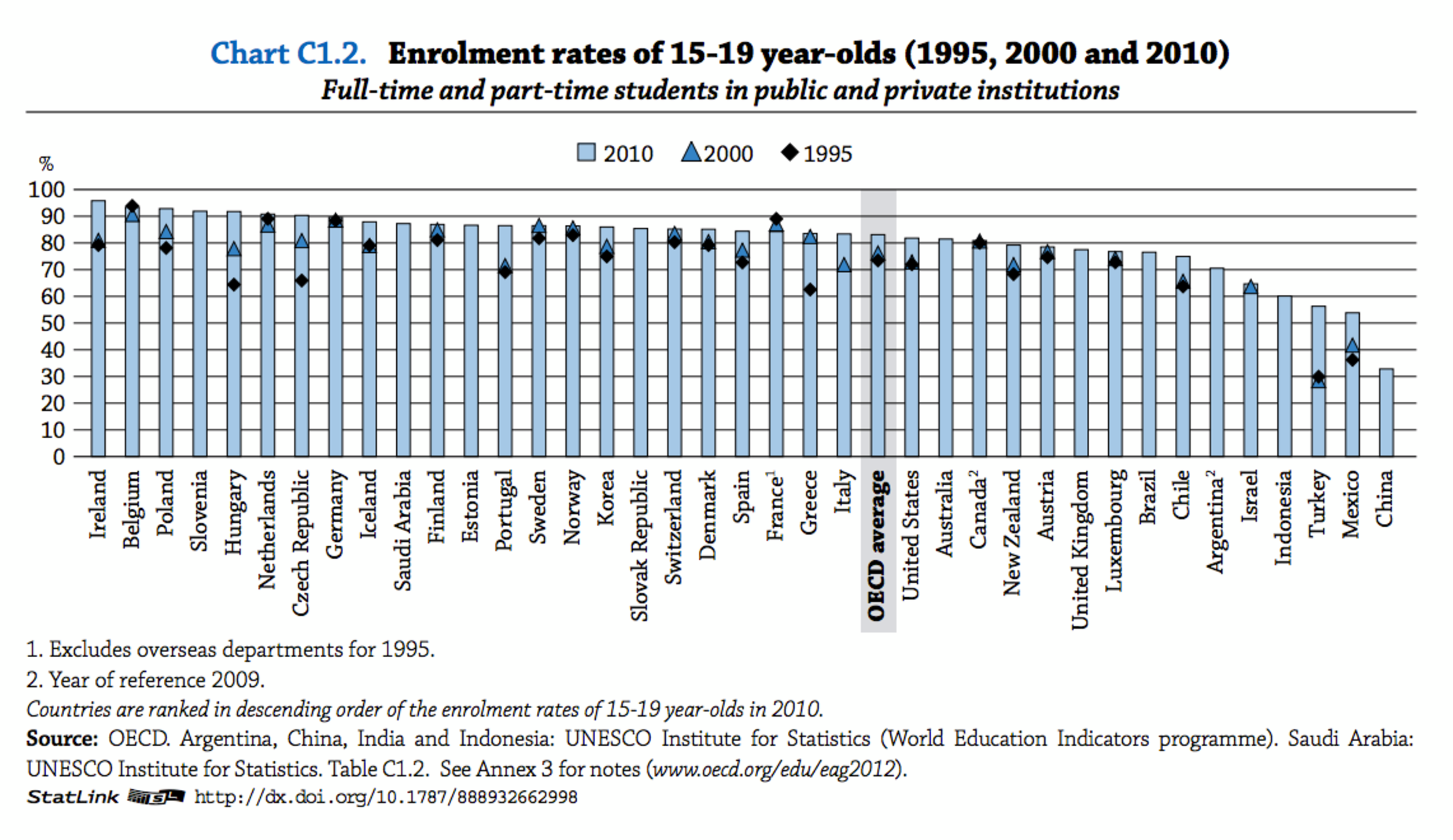 The most significant is the recorded fall in the numbers of 15-19 year-olds enrolled in full-time education and which the OECD described as “preoccupying”. Between 1995 and 2010, the percentage of this age group attending school in France dropped from 89% to 84%.