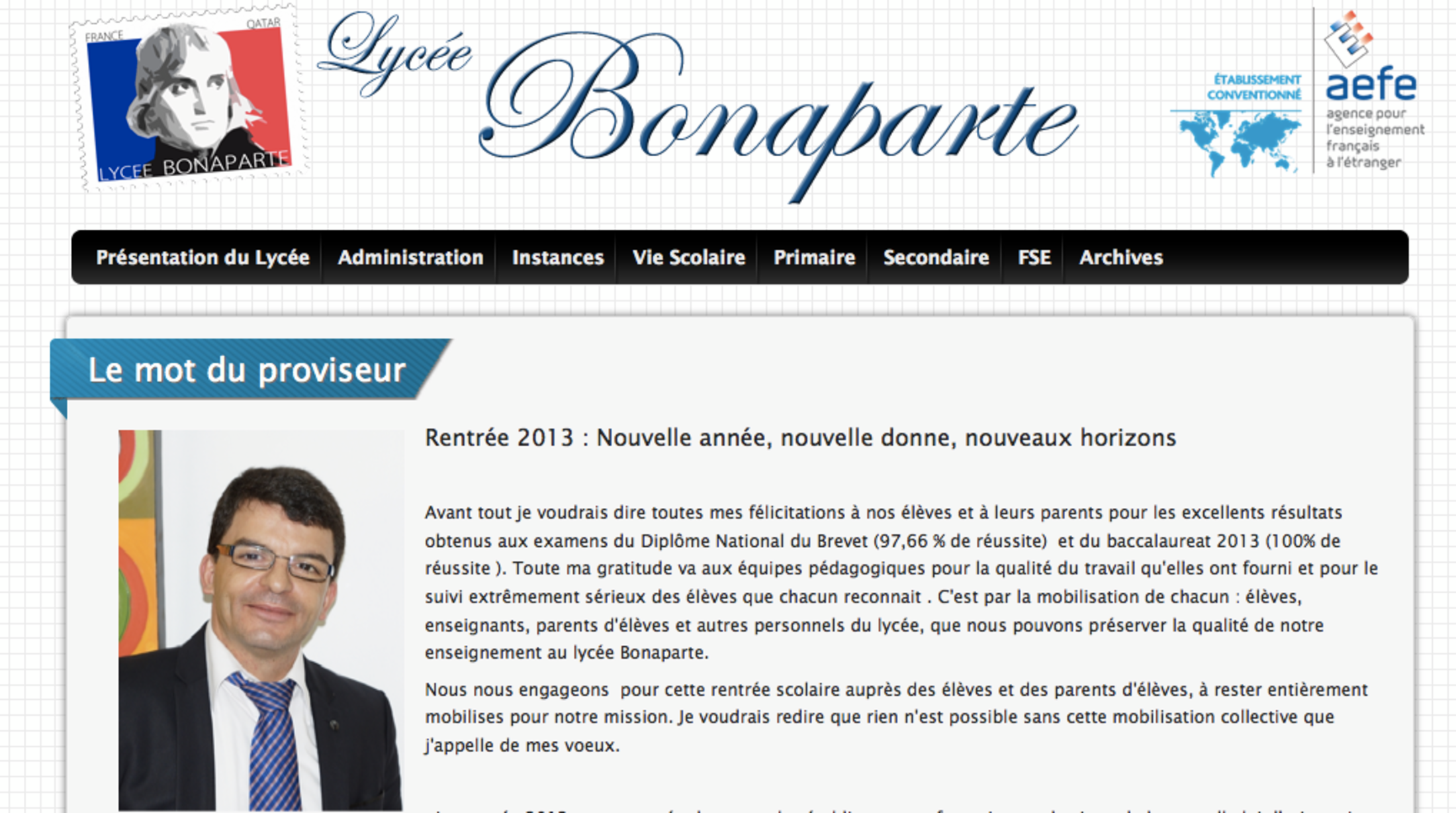 The complaint quickly led to the headteacher’s arrest. The French ambassador was alerted and it appears an agreement was quickly reached in which Hafid Adnani was released but was required to quit his job and pack his bags immediately for Paris – leaving his family behind in Doha. The sudden departure of Hafid Adnani came out of the blue for parents, who had no inkling anything was wrong. “On the Friday he was seen in Doha, and on the Sunday we were told he was in Paris!” says the mother of one pupil at the lycée, who asked not to be named. At the time of writing the headteacher was still on the school's website, as is his message for the start of the new academic year (see below).