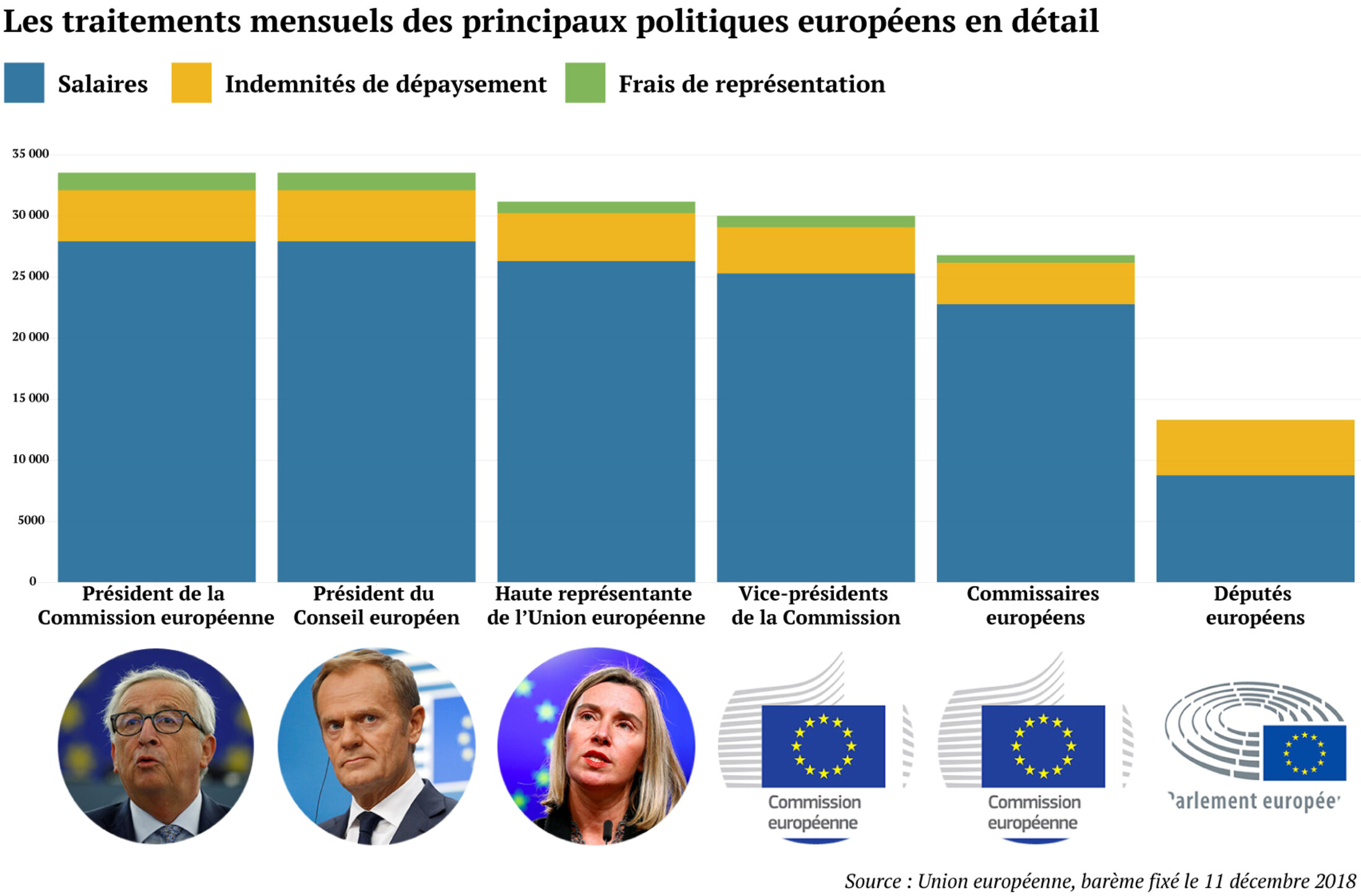 The other members of the Commission do not miss out either. Federica Mogherini, the High Representative of the Union for Foreign Affairs and Security Policy, receives a total of 31,731.63 euros a month between her gross salary and her various expenses and allowances. And the monthly gross salary and allowances for the Commission's vice presidents comes to 29,977.34 euros a month each.