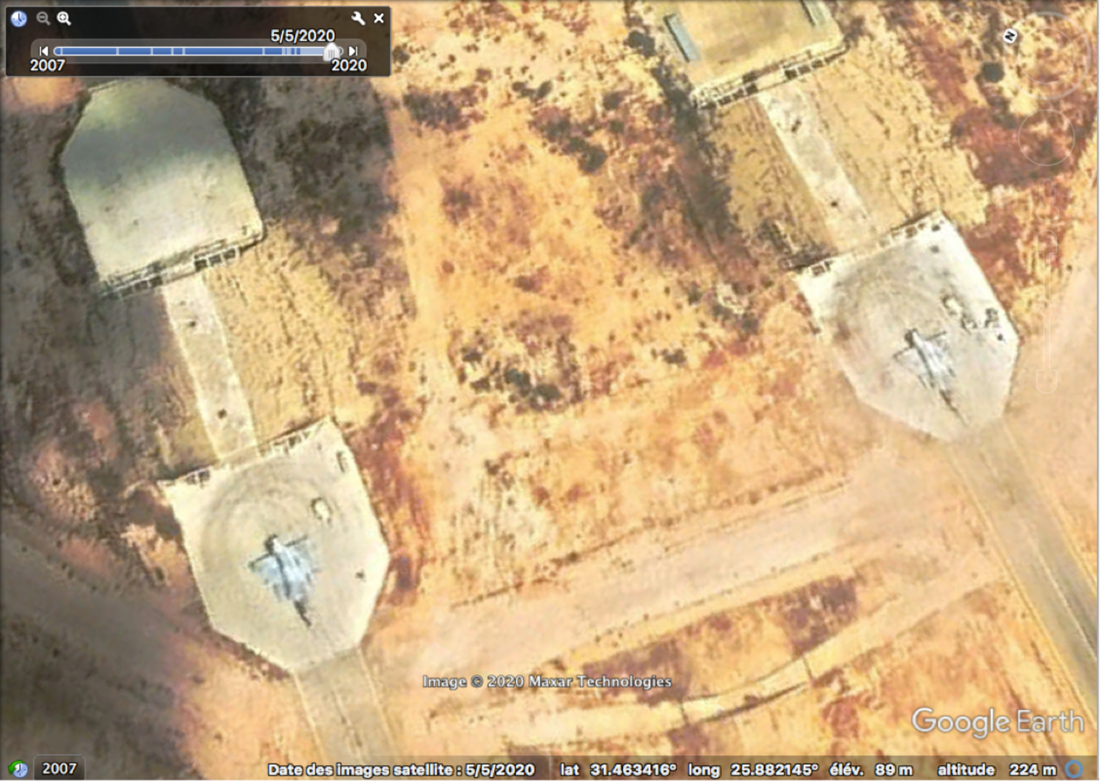 There is certainly no lack of evidence regarding the involvement over recent years of the UAE fighter jets in the Libya conflict. Using publicly available satellite pictures, Mediapart has established the presence on several occasions between 2019-2020 of its Mirage 2000-9 aircraft at the military base at the town of Sidi Barrani, in Egypt, which lies at about 90 kilometres from the Libyan border. The jets are painted in the light grey camouflage as used by UAE planes.