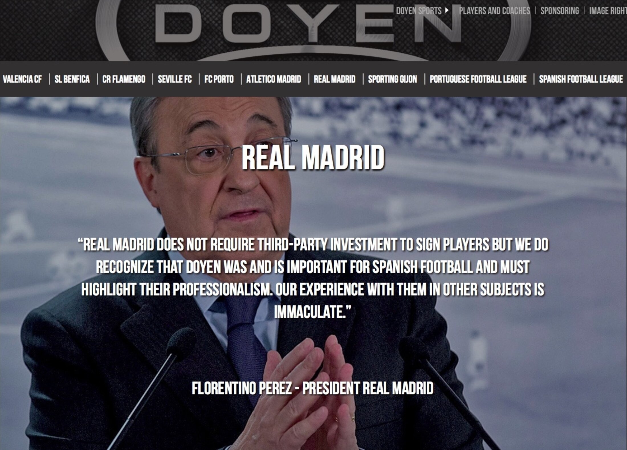 Perez, meanwhile, was quoted on the Doyen Sports website (see below) extolling the “professionalism” of the company, and recognising "it was and is important for Spanish football”. While he said Real Madrid received no TPO investment from Doyen Sports, “our experience with them in other subjects is immaculate” Perez is quoted as saying.