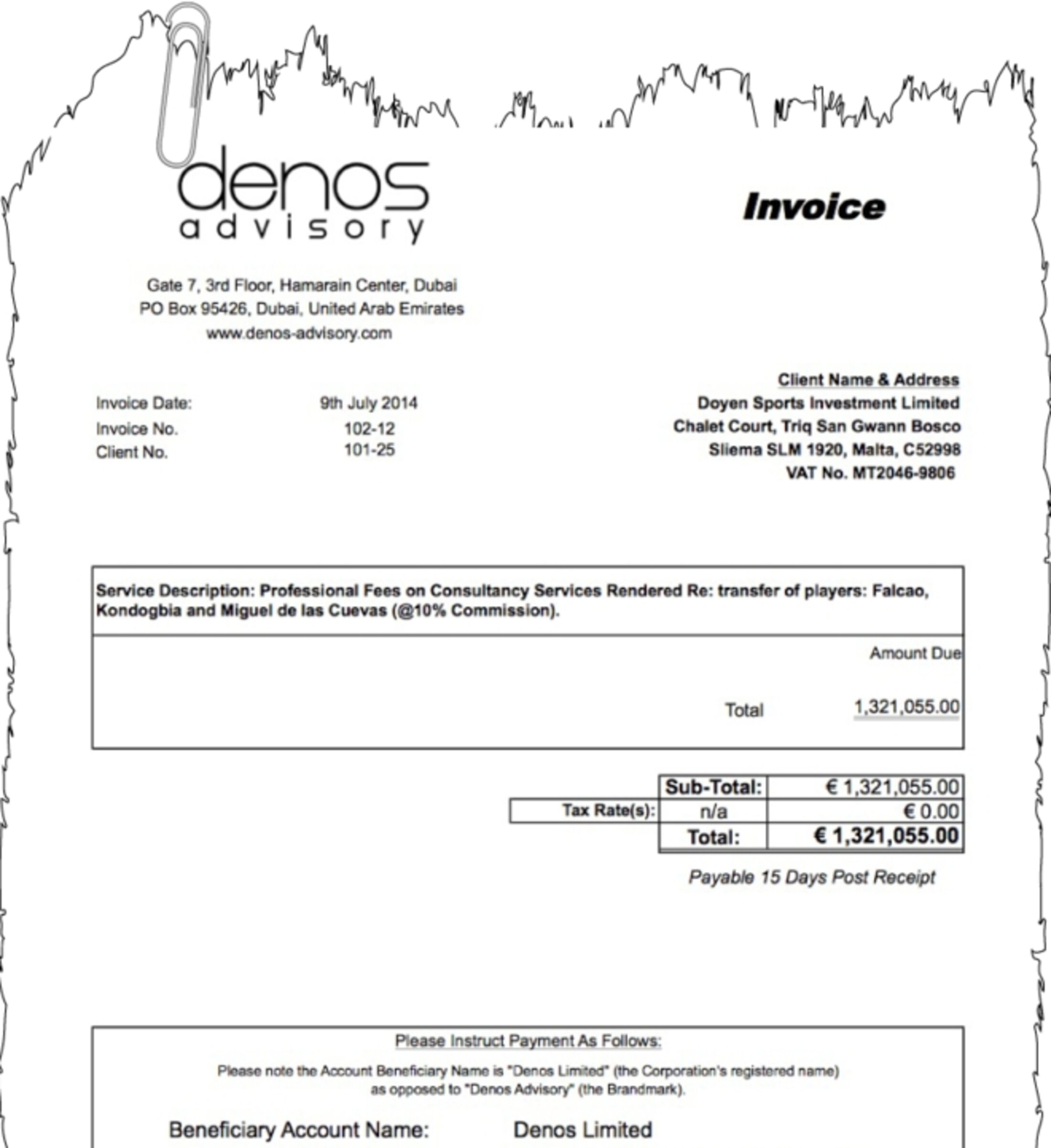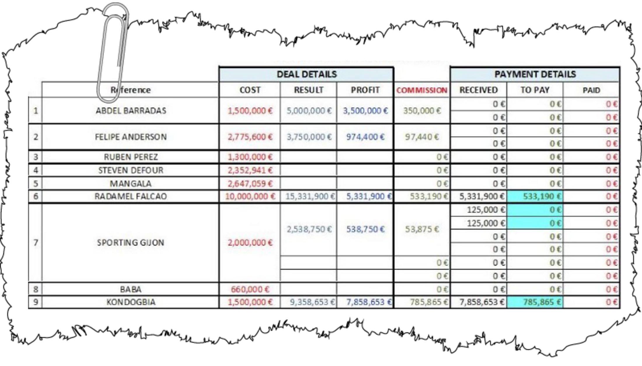 Doyen Sports was to send to Denos 10% of the profits made on transfers. Lucas would explain in one message that this arrangement was for “people we need to compensate” and who did not provide “paperwork”. On July 17th 2014, Doyen Sports made an initial transfer into Denos of 1.3 million euros, of which 785, 865 euros concerned the transfer of Kondogbia, and 533,190 euros concerned that of Falcao. The payment was camouflaged with a contract and an invoice indicating that Denos had engaged in an advisory role for the transfers. The Football Leaks documents do not reveal to who the money was ultimately destined.